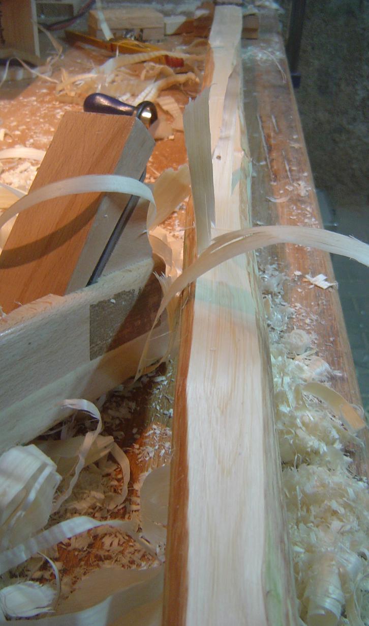 Erst mal hab ich den Bogen auf 1,80m gekürzt und die Mitte angezeichnet. Von der Mitte aus hab ich dann mit dem Hobel und dem Zugmesser den Bauch planiert. Und zwar soweit dass der Griffbereich noch eine Stärke von knapp 4cm hat und diese dann zu den Enden hin gleichmäßig auf 1,5cm runter geht.Auch dass geht bei frischer Hasel total fluffig und man kann wunderschöne lange Späne ziehen. Im Anschluss hab ich dann die äußeren Drittel der Wurfarme auf vorläufige 1,5cm verjüngt. Dazu erst mal anzeichnenund dann die Flanken weghobeln. Der gesamte Rohbau sieht dann so aus:Die Zeit zwischen dem Ersten und diesem Photo betrug übrigens gerade mal 3 Stunden.