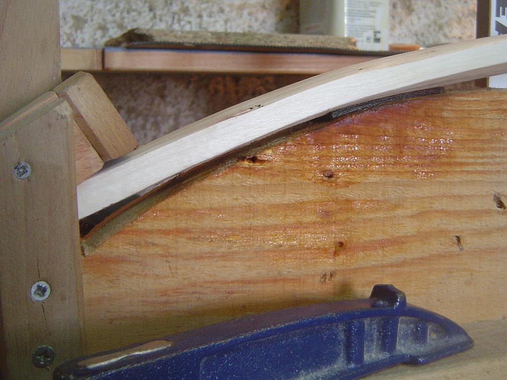 Ich hab s jetzt einfach mal probiert.Biegen ging soweit ganz gut. Gestern hab ich das Eine, heute das andere Ende gebogen. Ich laß den jetzt noch über Nacht auf fixiert. Morgen wird der Bogen dann auf einen Balken gespannt und dann gehts mit der Trockenphase und der Warterei los.