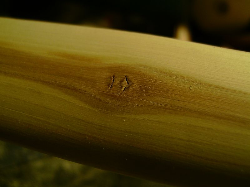 Äste (4 und ein kleiner), die nicht längs sondern quer angeschnitten sind, (bei den meisten Hölzern gar kein Problem), zeigen bei Flieder riskante Schlitze, an denen leicht unter Biegung Querrisse entstehen können! Eine Möglichkeit wäre, die mit Holzdübeln zu füllen. Da sieht aber fast immer "geflickt" aus...