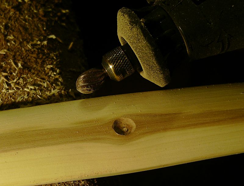 Dafür fräse ich mit der Dremel erst den gesamten Bereich etwas aus: ...und dann noch mal den Kernbereich des Zweiges mit einem kleineren Fräser noch etwas tiefer: Danach verfülle ich das mit Epoxi, zuerst mit rehbraun gefärbtem