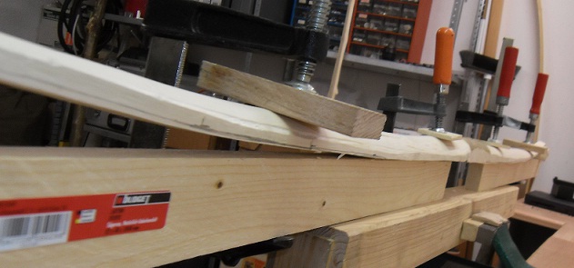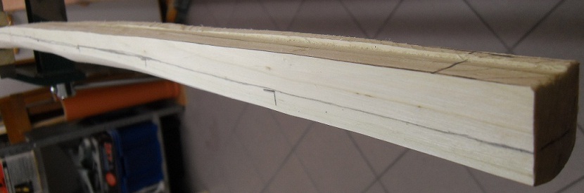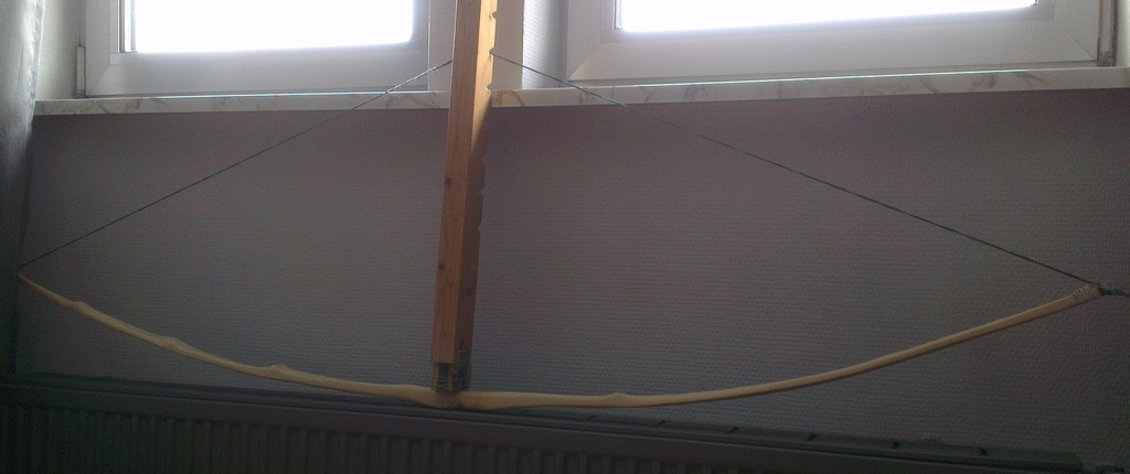 nach dem Sägen und etwas Holz abnehmen mit Ziehmesser, Ziehklinge und Feile wurde der Bogen ins Korsett gezwungen und zum Trocknen gelegt. Kellertemperatur ca. 21°C.