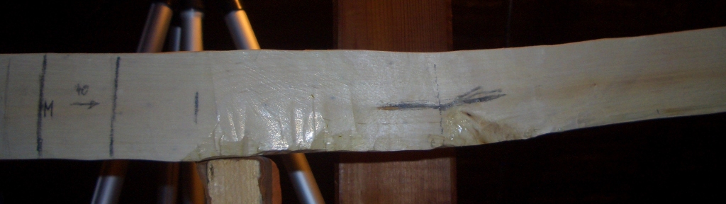Eigentlich wollte ich ohne Netz arbeiten, sprich nur mit der Eibe, aber als ich gesehen habe, dass es unter der Leimversiegelung der Stirnseiten des Ahorns nach einer Woche anfängt zu gammeln, habe ich den Sapling schnell gespalten und von der Rinde befreit. Außerdem habe ich den ehemals 266cm langen und 5,5cm breiten Sapling auf 172cm gekürzt, um einen möglichst gleichmäßigen Reflex zu bekommen.