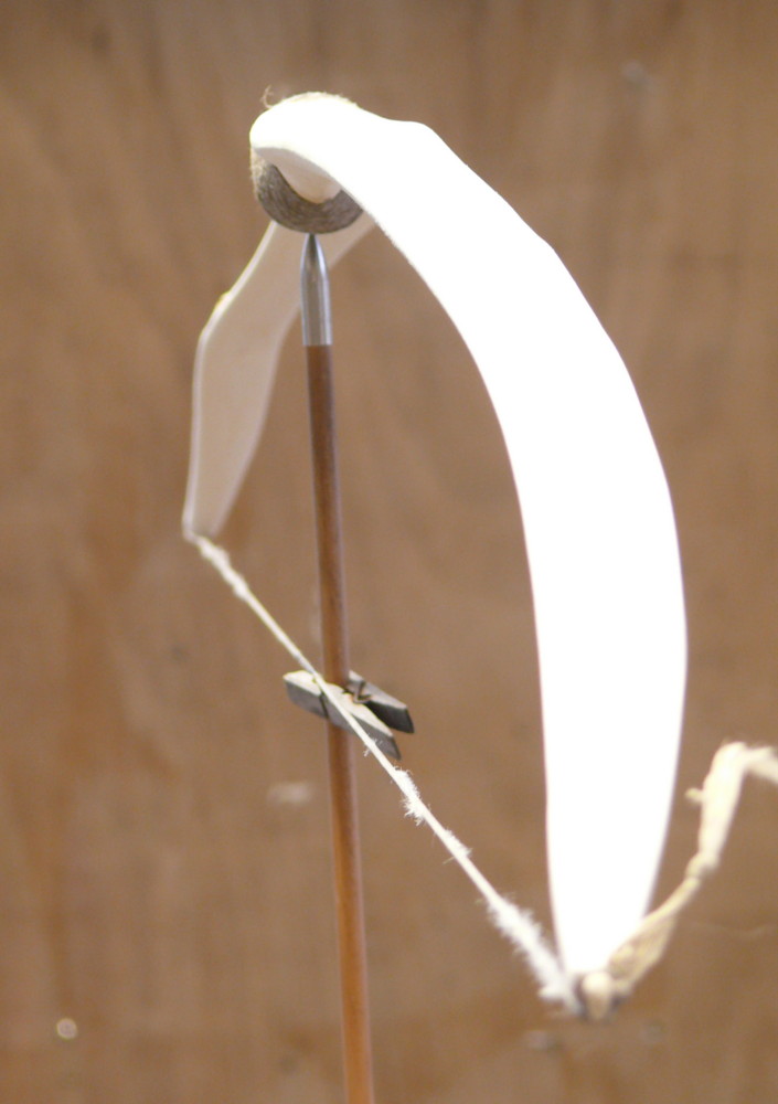 Der Schwerpunkt des Bogens liegt ausserhalb der Wurfebene (der grösste Teil der Wurfarm- Masse liegt rechts) - sieht man ganz gut auf dem ersten Bild mit fixierter Sehne. Auf dem 2. Bild ist nur die Fixierung (Wäscheklammer) gelöst - die Sehne schwingt nach links... vermutlich der Grund für das eigentümliche Schussverhalten. das Bögelchen misst jetzt also noch 150cm NtN und nach ein bisserl Nachtillern hats nu 40# @ 26" (mehr trau ich mich vorerst nicht zu ziehen) . Jedenfalls wirft er die Pfeile jetzt sauber raus und hat auch spürbar mehr Biss ...