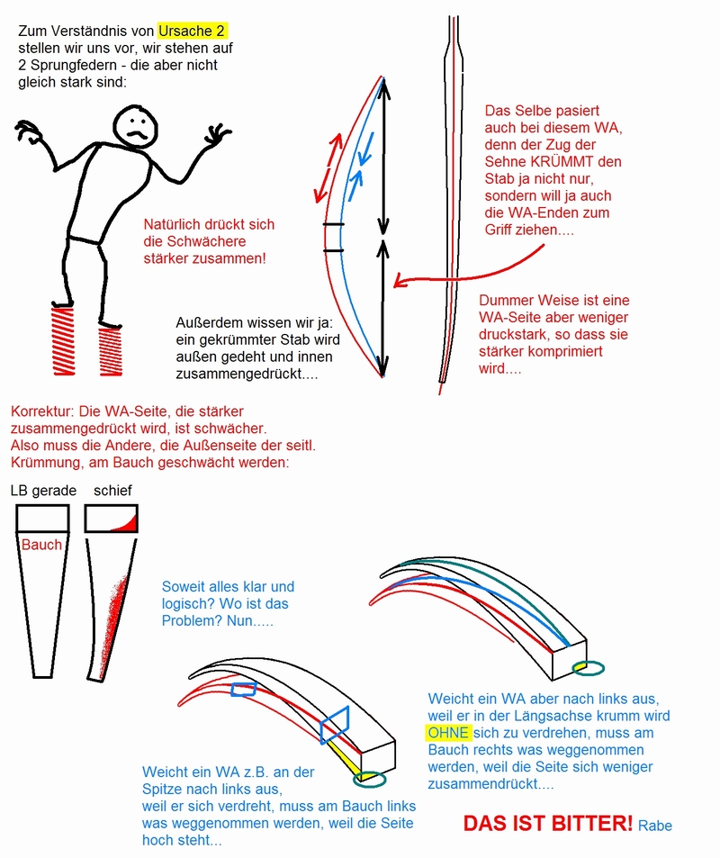 Normalerweise sagt man ja, dass wenn sich der Wurfarm verdreht, die "tiefere" Seite zu schwach ist (in der Skizze die linke Seite), und man daher an der "höheren" Seite Holz entfernen muss.