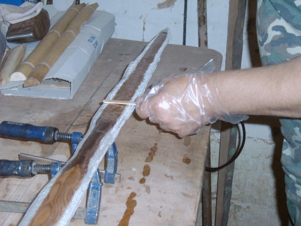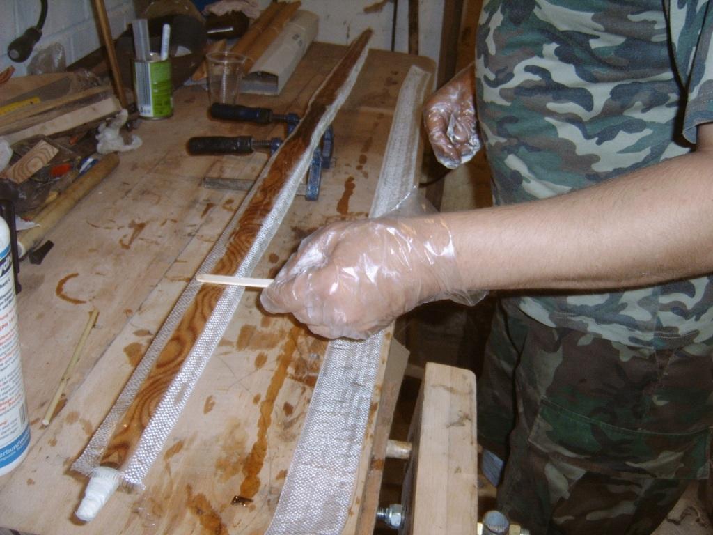 4: Mit Glasfaserband kann man auch eine unregelmäßige WA- Oberfläche (z.B. eines Selfbows, bei dem man das Zuggewicht erhöhen möchte oder der schlicht einen stabilen Bruchschutz benötigt...) mit Glas belegen...