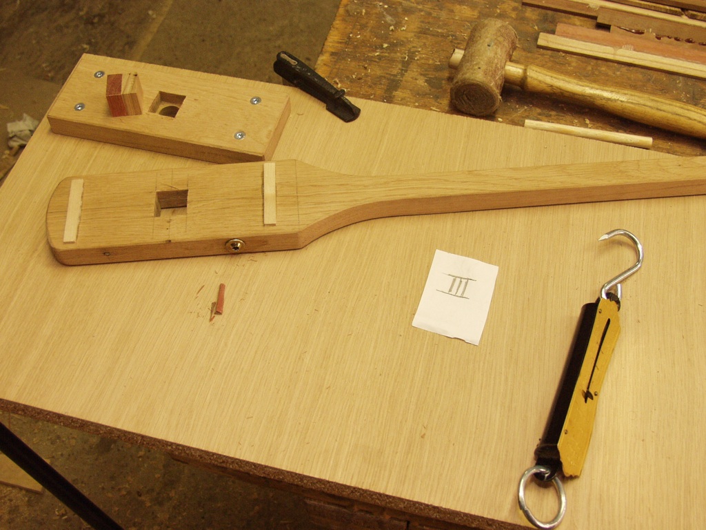 und weil ich das Thema wirklich wichtig finde - schließlich bestimmt eine gelungene Verleimung maßgeblich über Erfolg oder Mißerfolg eines Bogenbauprojektes - hab ich mir das Vergnügen gegönnt, die von Tim Baker (Bibel Band 1 S. 222 ff) vorgeschlagene Methode zum Testen von Verleimungen auf Massaranduba anzuwenden.