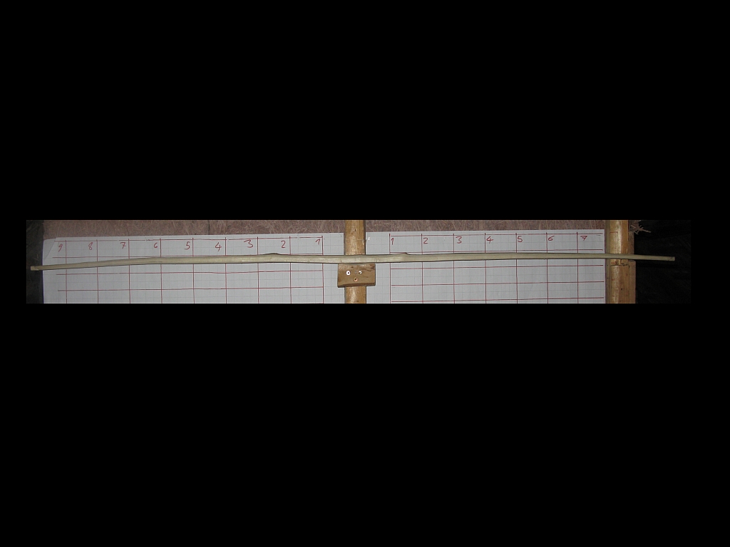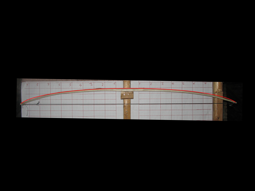 Der Rohling ungebogen... Beim ersten Ziehen mit der langen Tillersehne ist mir aufgefallen, dass der untere WA etwas zu steif war... daraufhin habe ich den unteren WA auf Gleichstand getillert und dabei auf den starken Setback des WA spekuliert DA ich so schnell wie möglich auf Standhöhe gehen wollte habe ich dann auf 7cm aufgespannt...