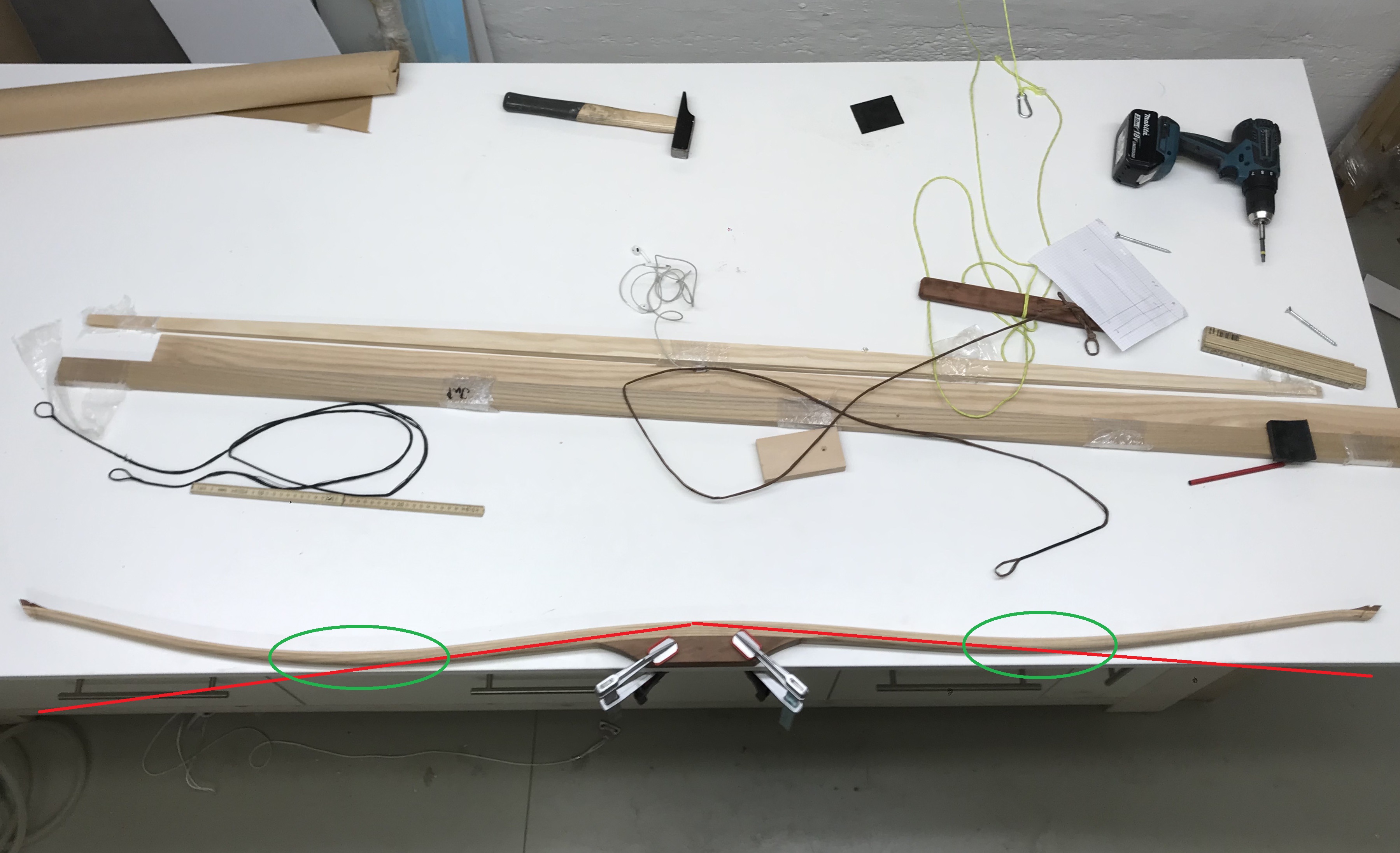 Du musst den Bogen zuerst igrendwo festspannen und erst versuchen, dass sich die Wurfarme sauber abrollen (siehe Bild). Die Wurfarme sollten eine gerade bilden ohne irgendwo abzuknicken. Erst dann kannst du den Bogen aufspannen ca. 3/4 Standhöhe und erst jetzt kannst du mit dem tillern auf dem Tillerstock anfangen. Beim Abtragen solltest du max. eine Ziehklinge benutzen und immer nur ein paar Züge abnehmen. Dann erst mal den Wurfarm ein paar mal bewegen, damit er auf die Abnahme reagieren kann. Vorsicht bei den Stellen , die grün umrandet sind, denn da wird es schnell zu viel.