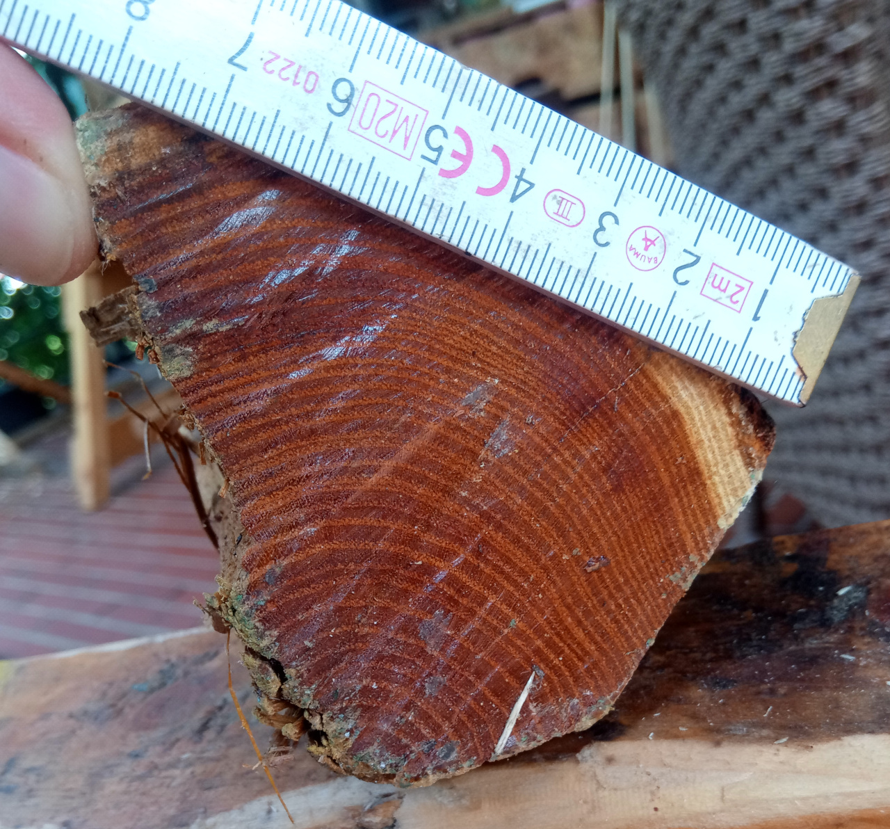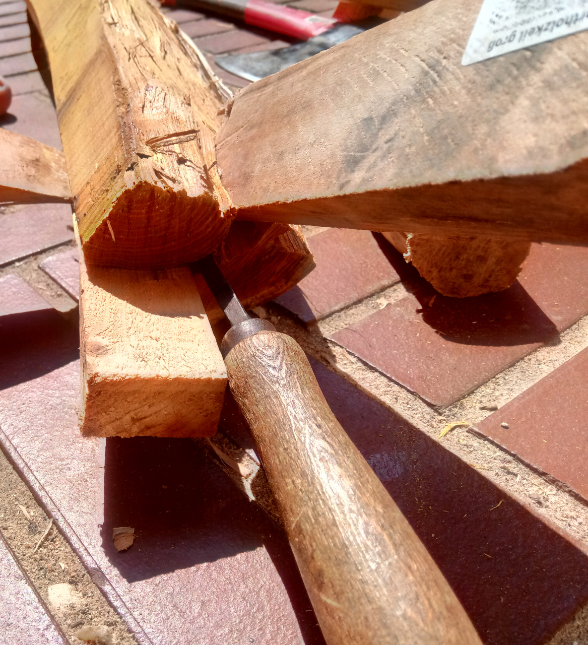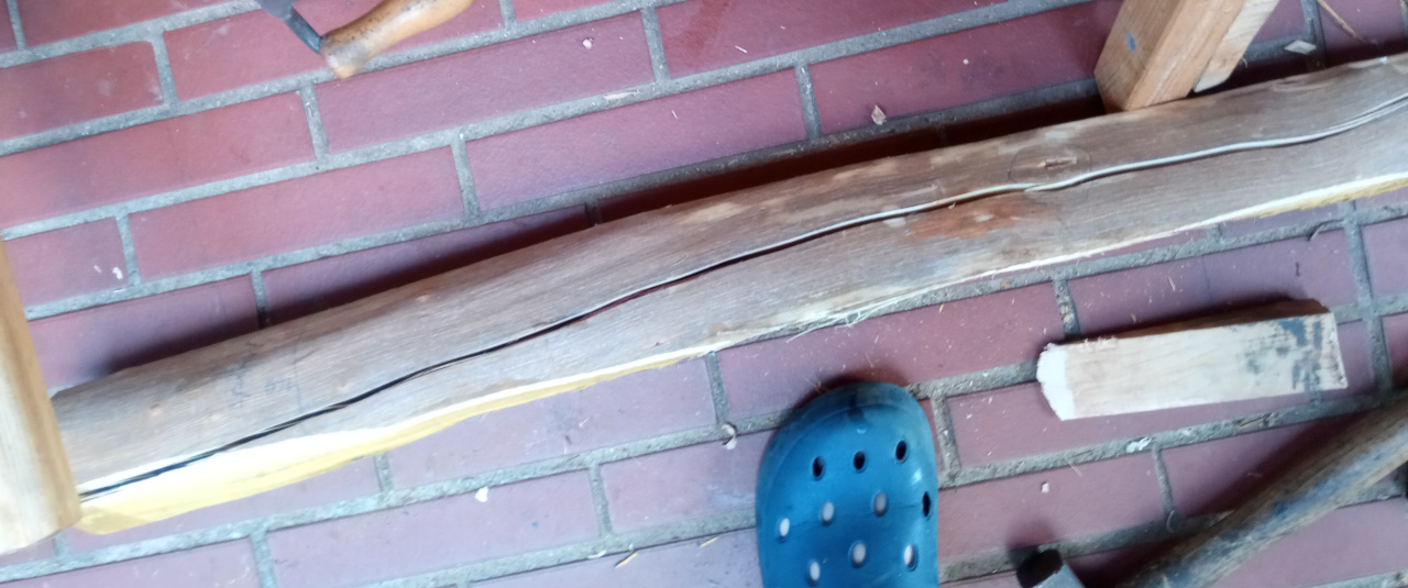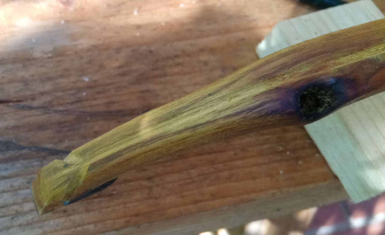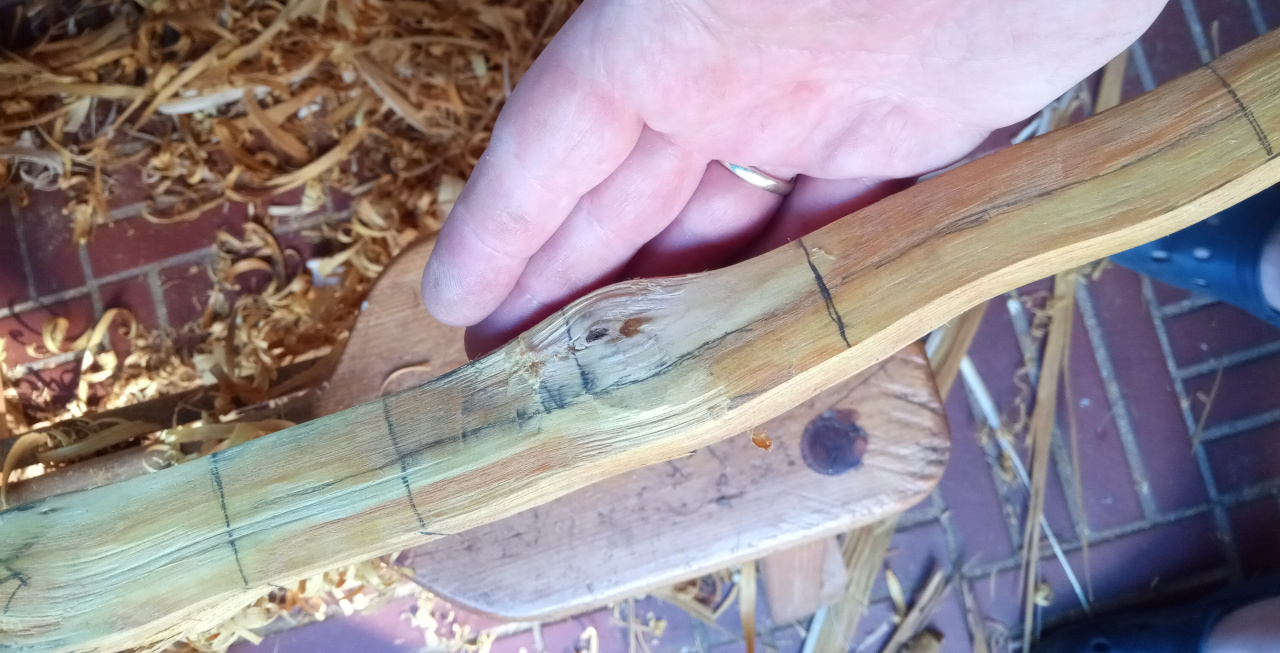 Also man nehme den ungarischen Osage-Stave mit ordentlicher Länge: Dann erstmal Jahresringe an Stirnseiten angucken: Also man soll Osage ja sogar im Jahresring spalten können. Hmmja, also mal ganz verwegen und größenwahnsinnig was einzeichnen: Und dann legen wir doch mit allerlei Werkzeug mal los: Nagut, es läuft so einigermaßen: Aber aber leider bleibt der Riß nicht zwischen zwei Jahresringen, es wurde also nichts. Wie sich später zeigte, hat dieses Stück enormen Zusammenhalt zwischen den Jahresringen und der Faserverlauf hätte ein solches Abspalten sowieso vereitelt.