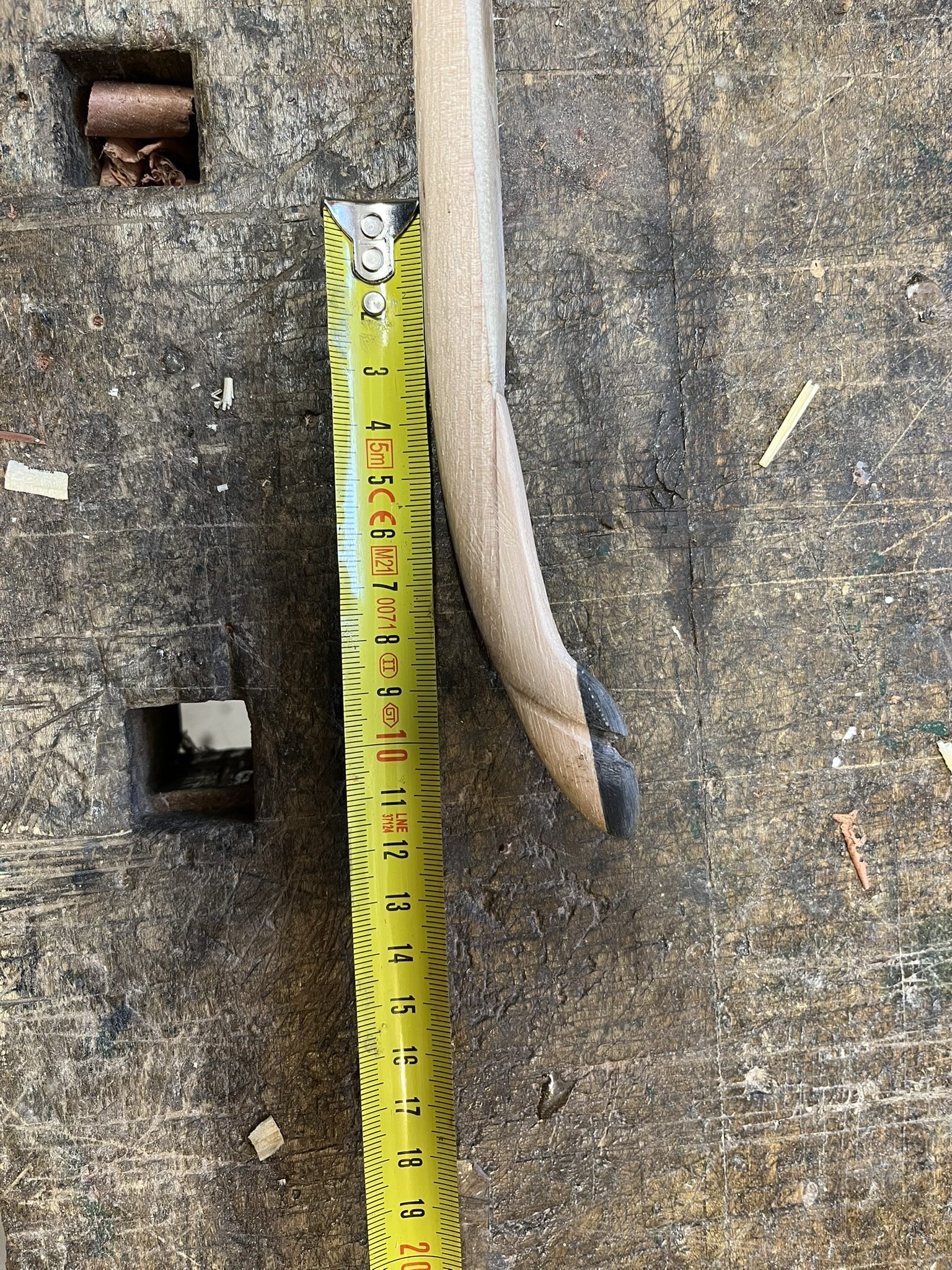 Ich würde entweder schichtweise aufbauen oder einen "Horn" aufkleben oder mit einem eingesetzten Dübel arbeiten (wie es Groszer u.ä. auch macht), evtl eine dünne Hornlage zur Verstärkung und vor Allem alles was nicht belastet wird aus leichtem Holz (>Balsaholz ) machen.