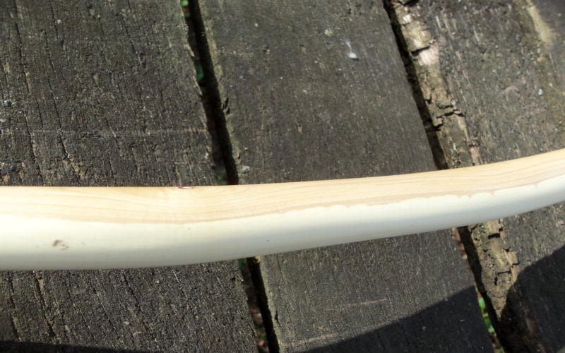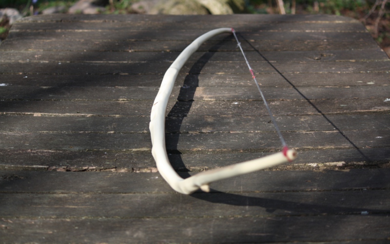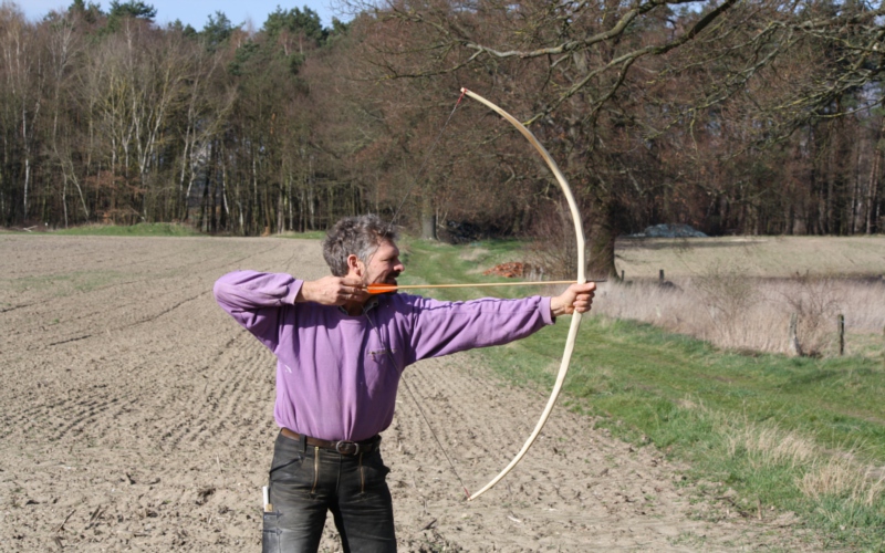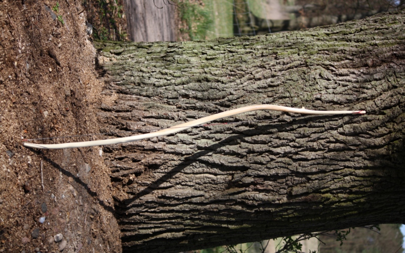 Beim ersten Bodenbiegen zeigte sich gleich die fantastische Elastizität des Holzes,ich lokalisierte die Sehnenkerben(die natürlich irgendwo liegen und nicht etwa auf dem Bogenrücken)und spannte eine provisorische Sehne auf.Nach 2x ziehen hatte ich die Eingebung,den Bogen nicht zu tillern,sondern ihn so asymmetrisch, wie er war, zu schießen.Ich ließ also die Feile liegen ,schnappte mir die Pfeile und ging vor die Werkstatt.Es ging dann alles ganz fix:den Anlegepunkt für den Pfeil wählte ich 1cm über dem Finger-Balancepunkt,den Nockpunkt fand ich da,wo die Sehne den Pfeil ganz gerade vor sich herschiebt und schon flog der erste...