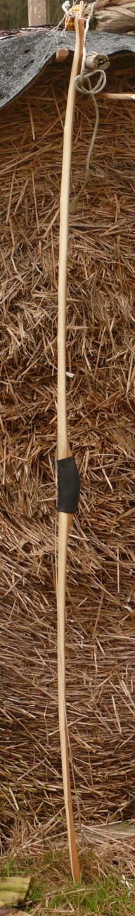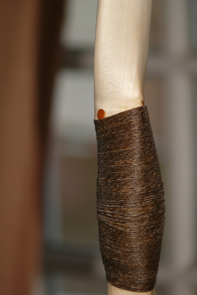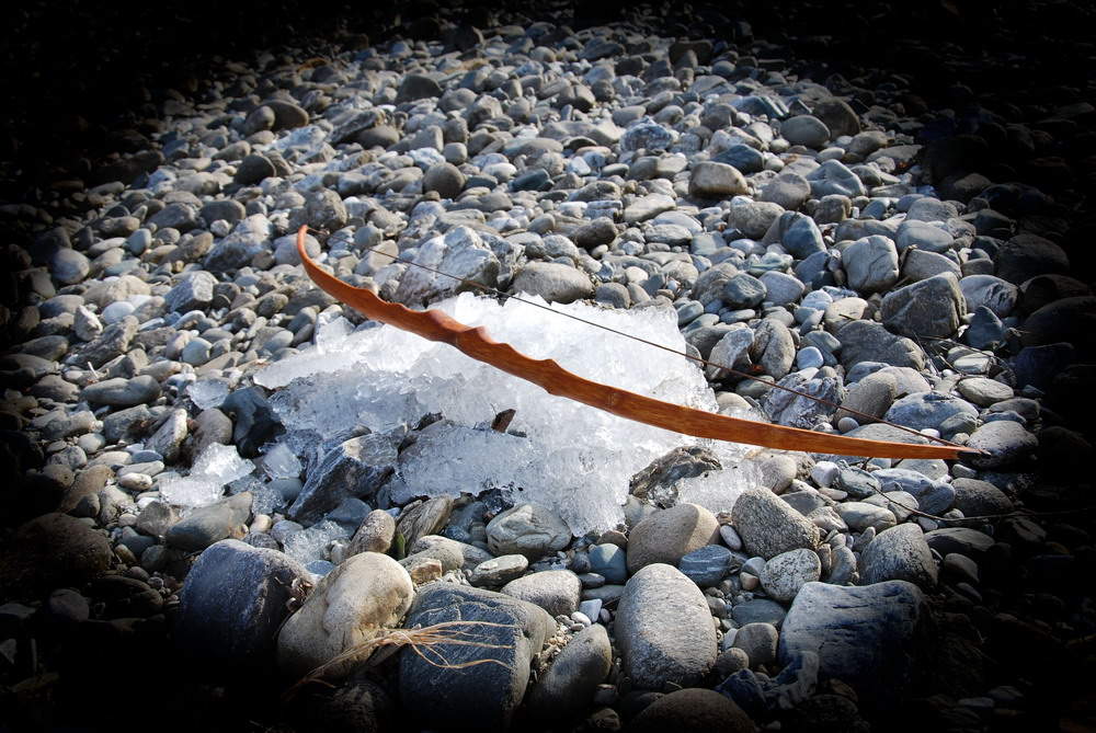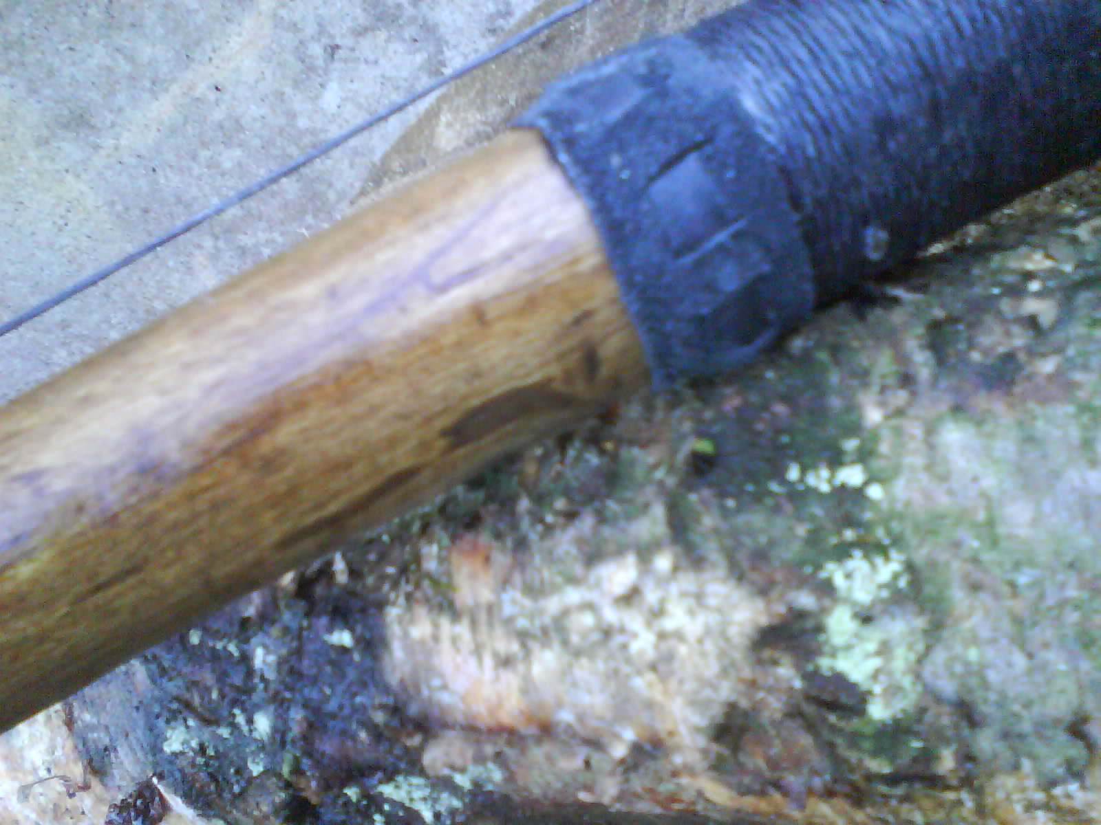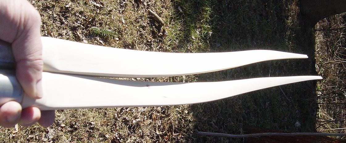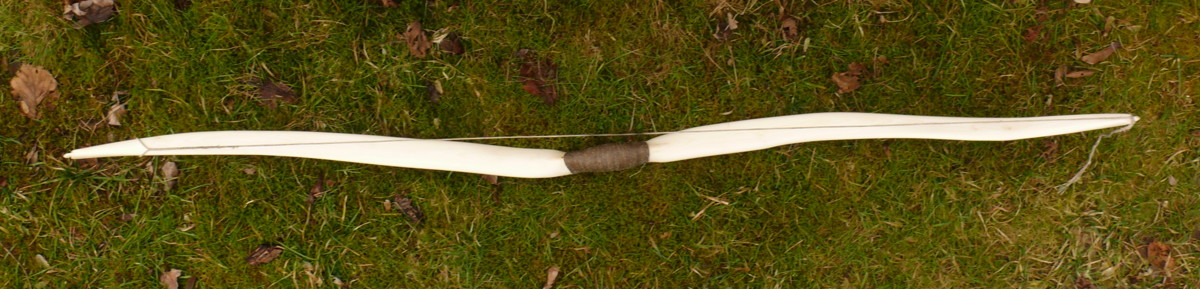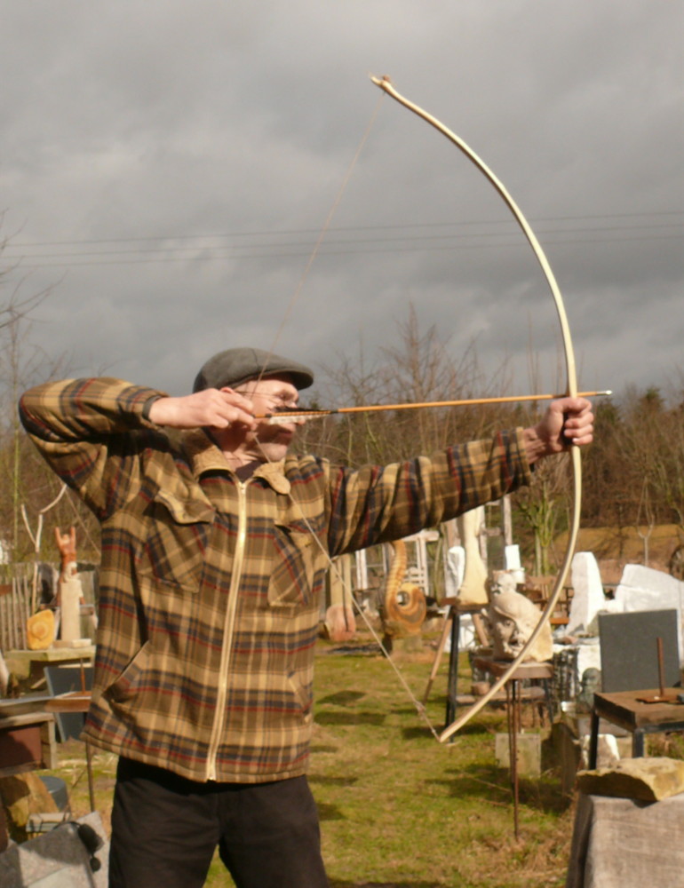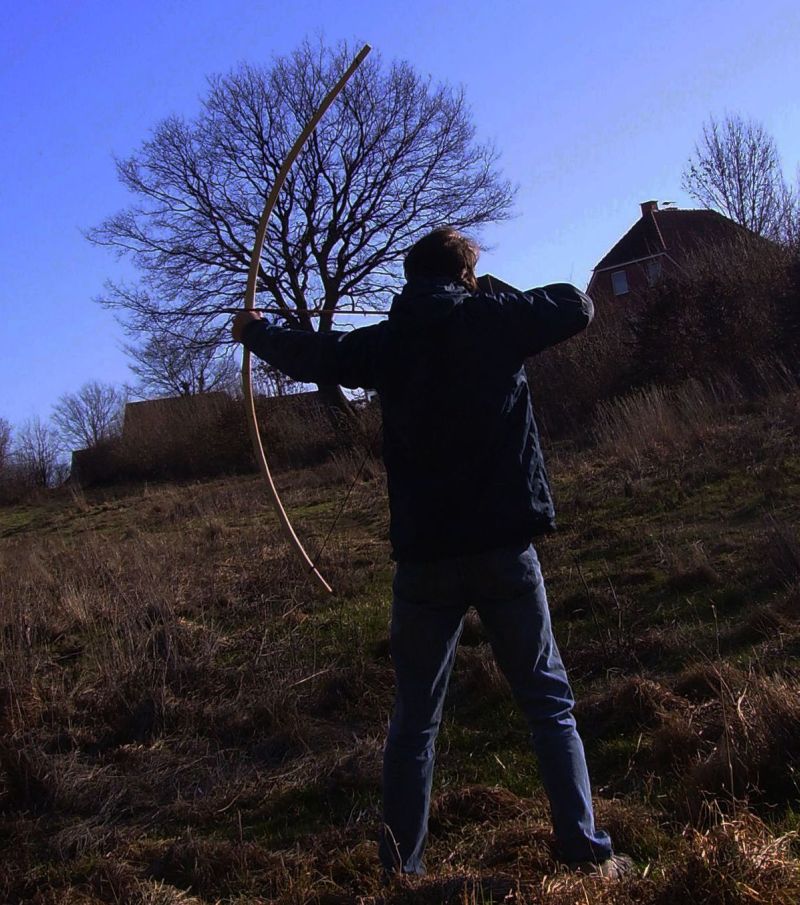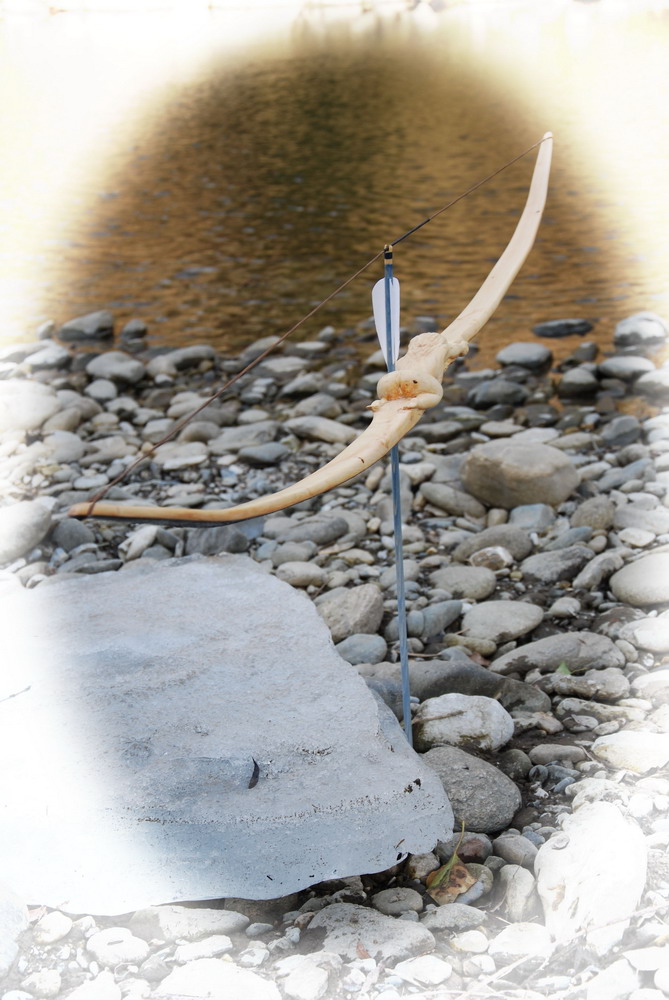Die Idee dahinter war, einen schlichten, funktionalen Bogen zu fertigen und sich dabei auf wenige "einfache" Werkzeuge zu beschränken. Aufgrund der natürlich gewachsenen Form des Holzes, hatte ich mich entschlossen, dem Bogen ein dem Winkingertypus ähnliches Design zu geben; daher die "langen Nocken".