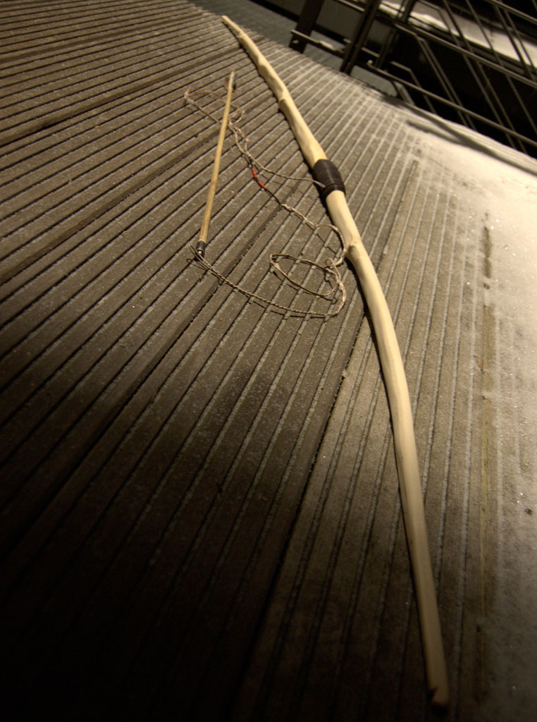 Es wurden zwei ziemlich gerade Äste für den Bogenbau ausgewählt. Die Sehne fluchtet gut über den ganzen Bogen