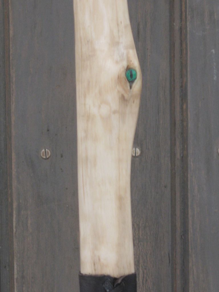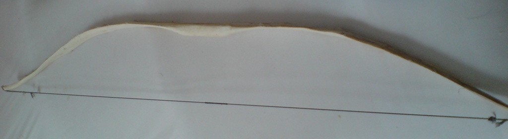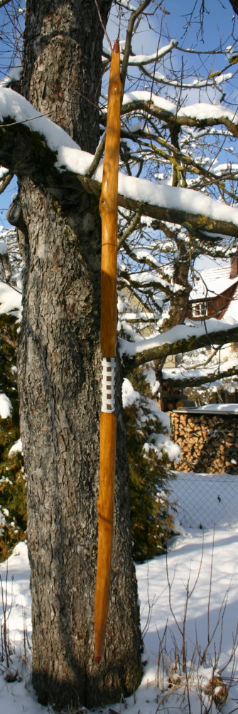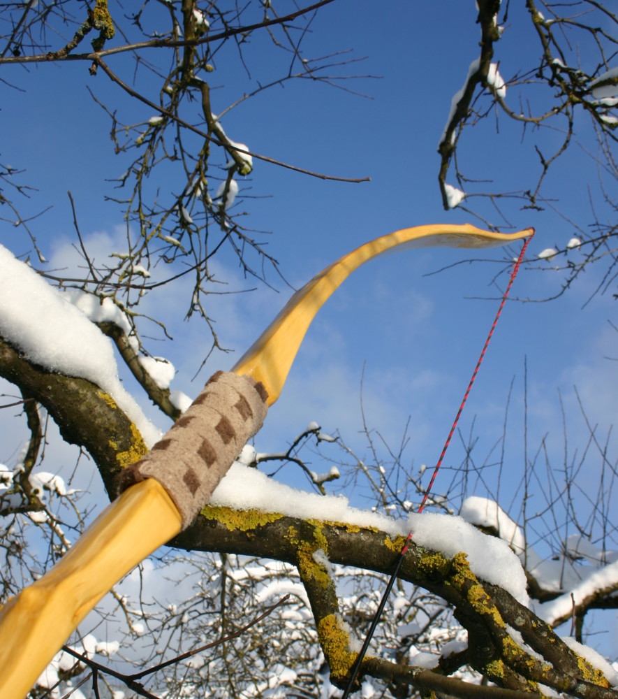 In meiner Jugend hatte ich mal einen Holunderbogen aus einem Zweig mit Rinde, der so als Stock ganz wunderbar geschossen hatte, allerding auch eher 8 denn 10 lb hatte. Aber sowas wollte ich mal ausprobieren, sozusagen ein Sapling in Reinkultur: Zwei Äste, nur die Rinde ab, zu den Enden ein wenig konisch hin geschnitzt, im Griff verleimt, Sehne dran, fertig. Natürlich mußte er dann für die Präsi doch noch aufwändig geschliffen und gebohnert werden und bekam auch eine yumi-mäßige Wicklung an den Griff.