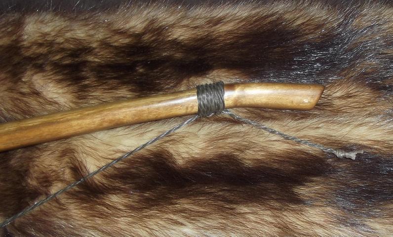 Die Nocke aus schwarzem Büffelhorn ist mit einem dübelartigen Fortsatz in den Markkannal geklebt. Die Sehnenkerbe liegt somit auf Holz und Horn.
