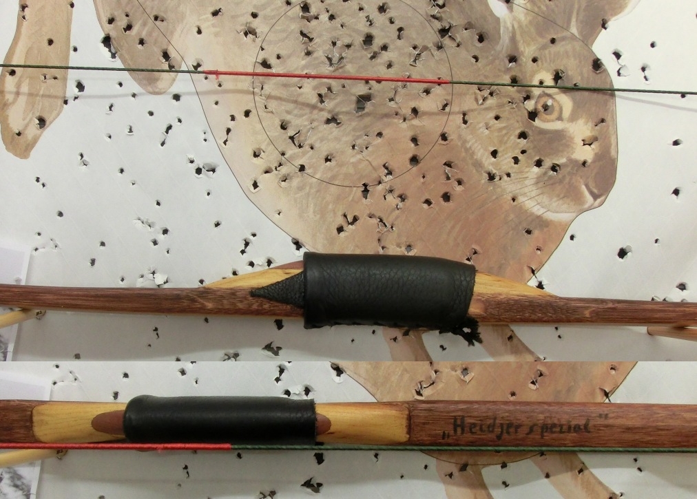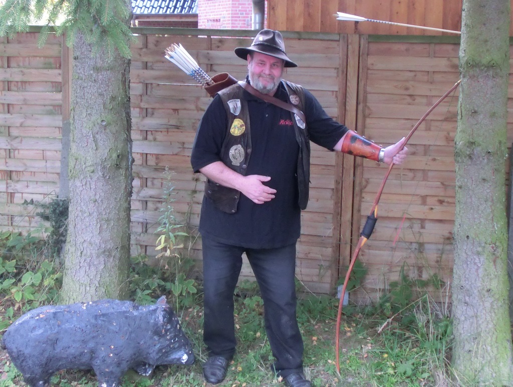 Über das Bild von seinen Sohn, übrigens einen sehr talentierten Jungbogenbauer und Bogenschützen habe ich mich auch sehr gefreut, ich musste das Bild glatt nachstellen, nur statt Heidschnucke musste unsere arg gefledderte Einschießsau herhalten, wie man sieht, ist die halbseitige Gesichtslähmung fast wieder weg. Nun zum Bogen, ein Hillstylebogen genau in dem Stil den ich so mag, jetzt verstehe ich auch die Fragen die immer so nebenbei im Chat kamen. Die genauen Daten habe ich noch nicht ermittelt, dürfte aber so um 55# bis 60# bei 29,5“ Auszug haben, nun geschenkt oder nicht, der wird am Wochenende genau vermessen. Hier noch mal der Griff, andere Bilder werde ich am Wochenende noch bei besserem Licht machen. Also ich bin immer noch ganz fertig und freue mir gerade ein Loch in den Bauch, da wird das Gastgeschenk das in 4 Wochen fällig wird, wenn wir uns in Paderborn bei der Messe treffen, wohl doch nicht so spärlich ausfallen dürfen, muß ich eben noch mal schnell ein paar Pfeile bauen.
