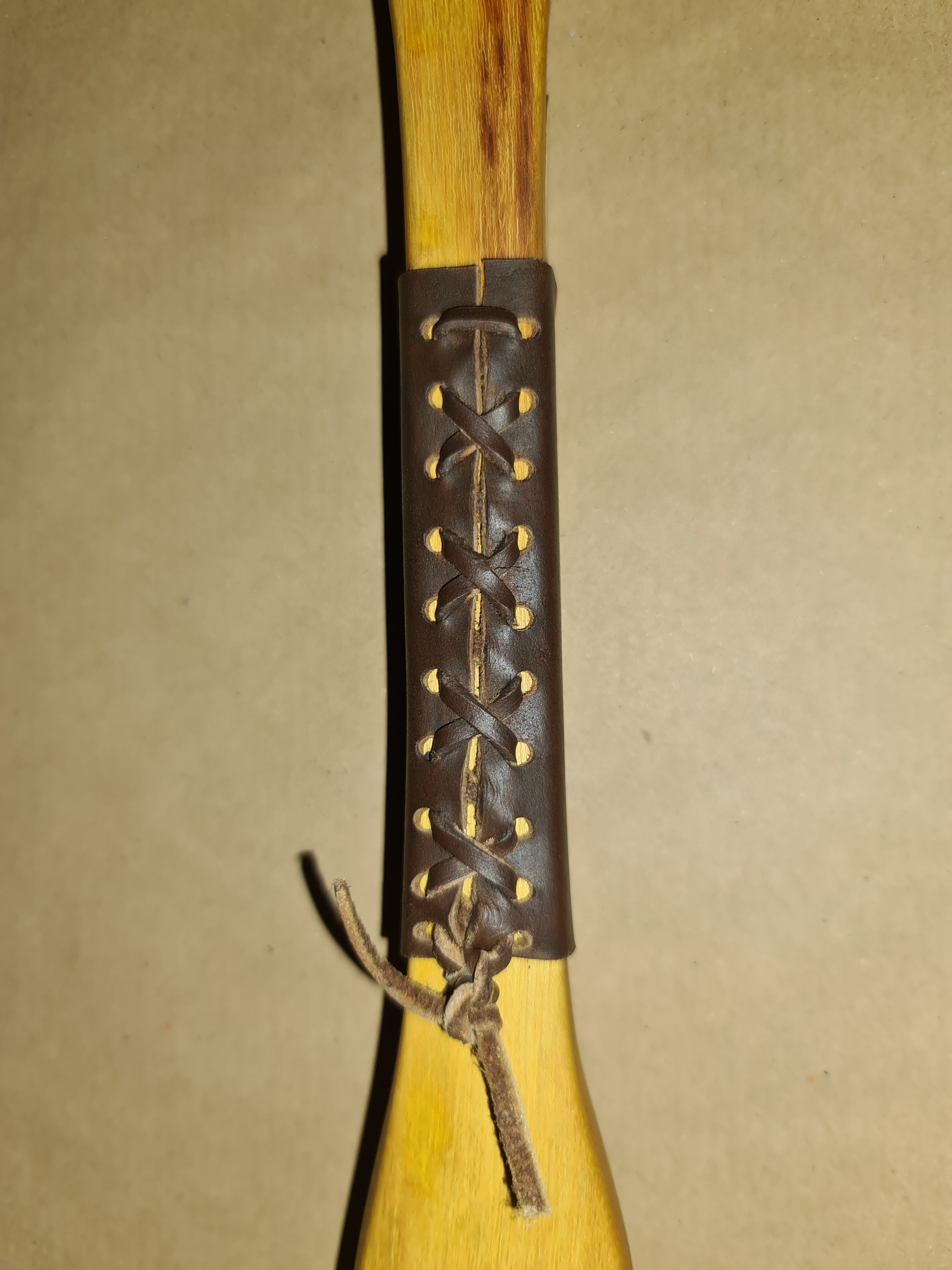Materialien: Overlays aus Horn, Griffleder vom Rind, Pfeilanlage Hauer vom Schwarzkittel, Sehne 14-Strang Dacron B50 (flämisch gespleisst)