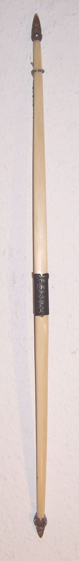 65 cm Haselnuss, Sehne im flämischen Spleiß und aus Nägeln geschmiedete Spitzen mit Schaftdorn.