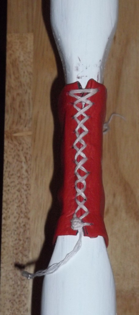 Griffstück rotes Kunstleder mit umgeklappten und verklebten (Sek.kl.) Kanten, auf dem Rücken vernäht