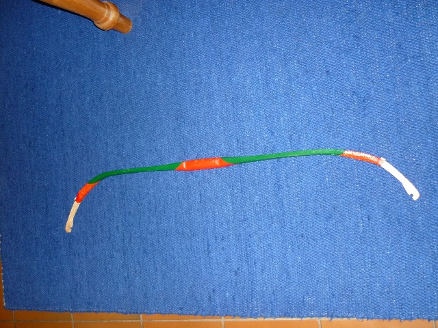 @Firestormmd: Die Wurfarme sind an den Enden reflex gebogen, Set hat der Bogen eigentlich nicht, aber nach dem Abspannen beträchtlich Stringfollow. Das kann man aber mit kurzen Biegen in Reflexrichtung wieder rausbekommen. Vielleicht kriege ich das beim nächsten Mal noch besser hin.