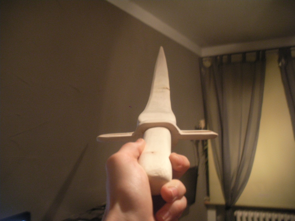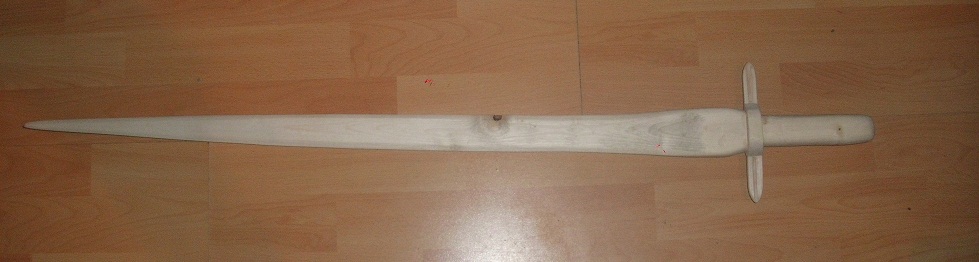ich hatte heute mal Langeweile, keine Lust zu entrinden oder einen Bogen zu bauen. Also habe ich die noch lebende Hälfte meines Ahorn-Flatbows zu einem Einhandschwert umgewandelt. Just 4 Fun ohne weiteren Sinn. Von Schwertern habe ich keine Ahnung, ist einfach so nach Gefühl umgebaut.