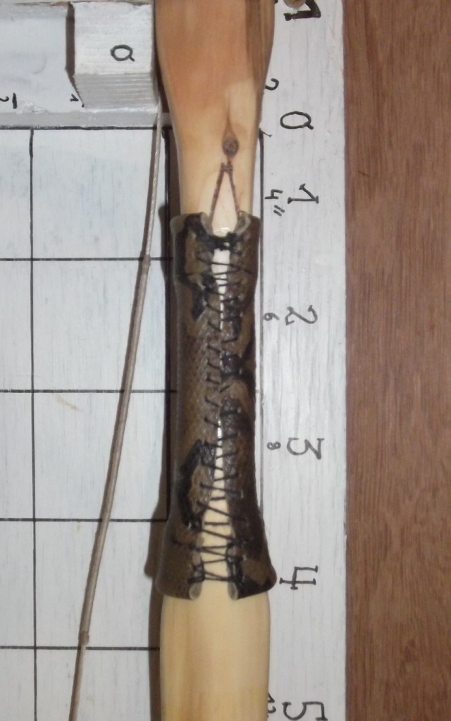 Ich find den oberen Wurfarm in der äußeren Hälfte zu steif. Den dicken Gnubbel hätte man vermutlich sogar komplett rausnehmen können, ober so hat er halt mehr Charakter. Außerdem find ich, dass das Holz total schön glänzt. Eigentlich hätte der Bogen ein schöneres Griffleder verdient und nicht so ein Stück DAmenhandtasche ;)