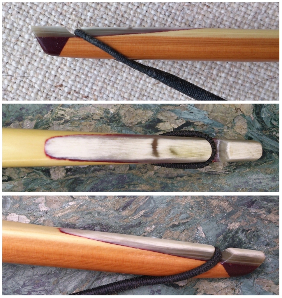Der helle Abschluss ist aus dem gleichen Hornstück, aus dem ich die Overlays geschnitten habe. Das Horn wurde bis auf die obere weiße Schicht runtergeschliffen (weniger als 1 mm dünn), am Bogen vorgebogen und dann mit weiß eingefärbtem UHU Endfest verklebt.