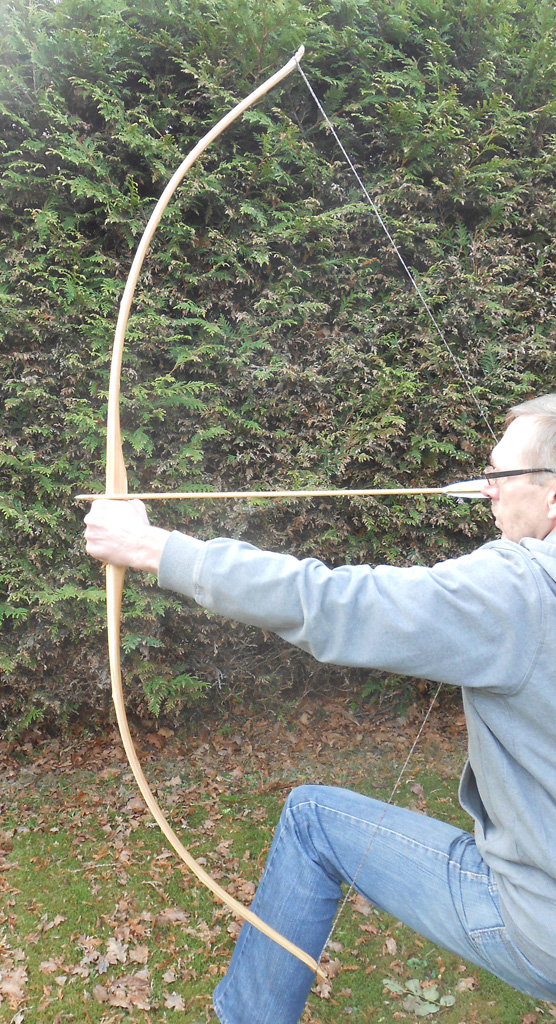 Bei der Stärke des Kernlaminates habe ich mich allerdings ein wenig verschätzt. 8,5 Mitte auf 7,5 mm an den Tipps ist für das geplante Zuggewicht von ca. 50# deutlich zu viel, daher ist der Bogen auch sehr schlank geworden. Die reflexen Wurfarme neigen beim aufspannen mit der Spannschnur zu seitlichen Verdrehungen. Trotzdem hat es eigentlich ganz gut funktioniert, obwohl ich mit dem Ergebnis noch nicht voll zufrieden bin. Der nächste Versuch ist auch schon wieder in Planung/Arbeit, die Bambusleisten sind schon geröstet.
