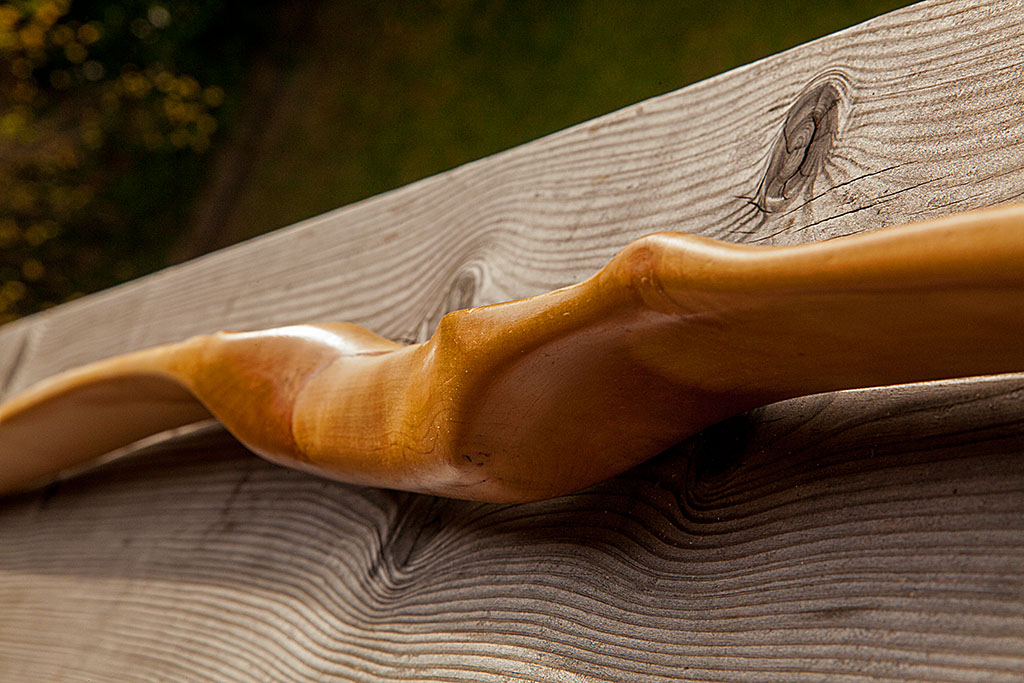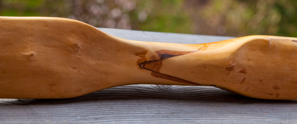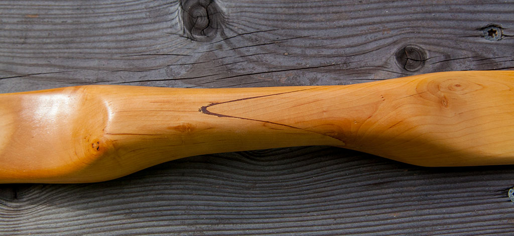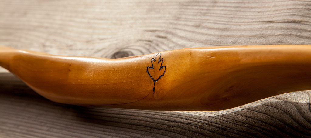 Trotz vieler Zeichnungen die ich anfertigte sah ich keine vernünftige Möglichkeit einen Bogen in diesen Stamm zu legen. So entschloß ich mich wehen Herzens diesen schönen Stamm in der Mitte aus einander zu sägen und meinen Ersten gespleißten zu versuchen. Ursprünglich war der Plan den Spleiß unter einem Griffleder zu verstecken, hab ich aber aufgegeben da mir der Griff so gut gefällt. Als Markierung für die Pfeilauflage hab ich mit der Sonne und einer Lupe die Umrisse eines Weißdornblattes eingebrannt.