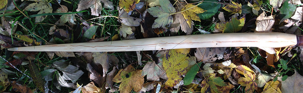 Über den gesamten Bogenrücken ziehen sich oberflächliche Verfärbungen, die möglicherweise von Frassspuren herrühren. Keine Ahnung. Die Verfärbungen haben das Freilegen und Schleifen des Bogenrückens überstanden und so hab ich sie drauf gelassen weil ich sie urig finde.