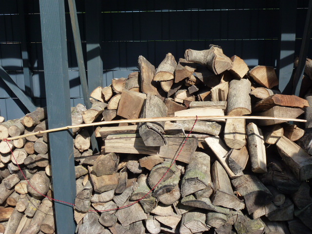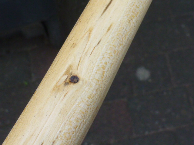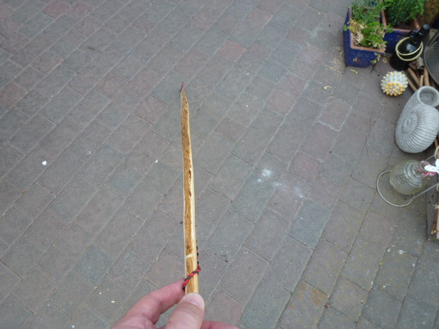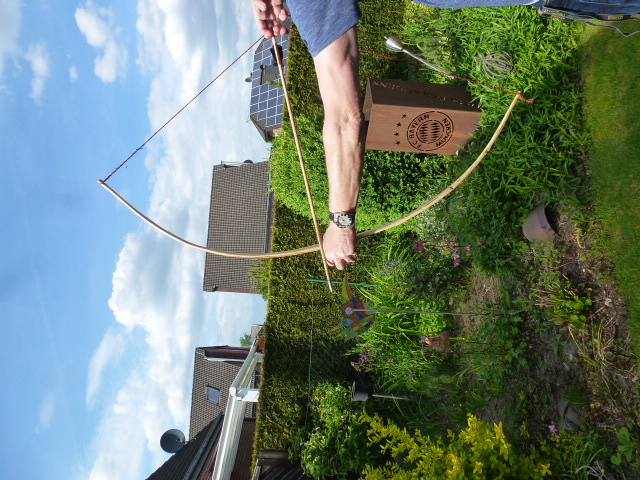 Der Weißdorn aus dem Saplingbow 2017 war aufgrund vieler von aussen nicht sichtbarer Faul/Totholzstellen nach dem runterarbeiten auf den Markkanal schon beim Feuerholz gelandet,als meine Schwägerin ankam,kannste nicht,machste mal... für den Kleinen.Mit 22" Auszug kommt er momentan hin,auf dem Foto zieh ich bis 24",da hat er 20#.Nächsten Monat hat er Geburtstag,bis dahin werd ich dann noch ein paar Pfeile basteln.