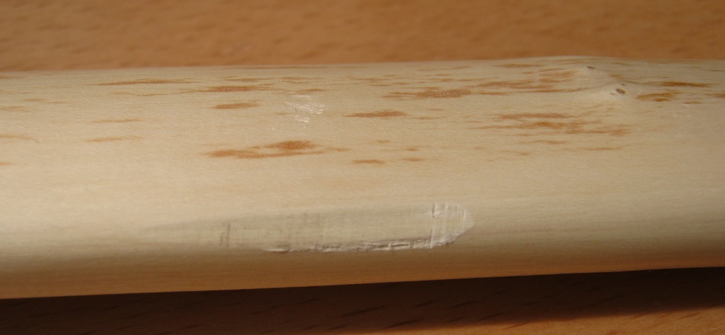 Der Bogen fliegt mir um die Ohren. Schäden sind gering. Also Schäden geschliffen und mit Kleber überzogen. Nocke neu geklebt.
