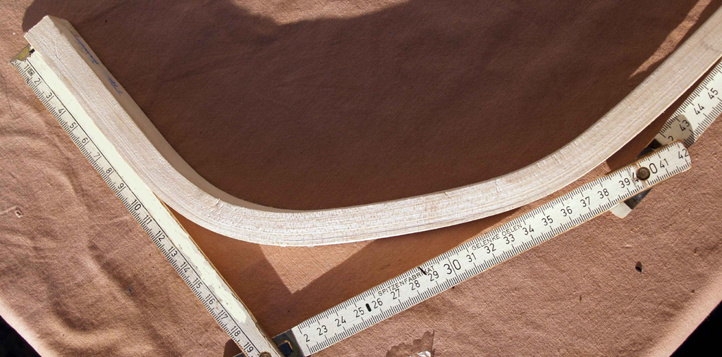 WA- Biegen: Das ofengetrocknete Holz wurde zunächst 10 Tage lang in kaltem Wasser eingeweicht, bei zweimaliger Desinfektion der Oberfläche mit kochendem Wasser bzw. Wasserstoffperoxid 0,2%ig. Es wurde dann in der Dampfkammer 50min bei 98°C erhitzt und dann nach der Thonet-Methode auf der Schablone gebogen. Bei der Thonet-Methode wird im späteren Bauchbereich ein Stahlband sehr fest an den Holzenden angeklemmt. Beim Biegen nimmt dann das Stahlband die gesamte Zugkraft auf, die neutrale Fase liegt zwischen Holz und Stahlband. Das Holz bekommt so nur Druck (Stauchung) ab, was es bei dieser Dicke besser aushält als Zug. Das Verfahren ist seit langem ein bewährtes industrielles Verfahren z.B. für Möbel. Nach dem Biegen ließ ich die WA´s abkühlen und habe dann die Stahlbänder innerhalb weniger Sekunden entnommen und die WA´s wieder auf der Schablone festgespannt, das Ganze muss schrittweise gehen damit das gebogene Holz sich nicht zurückbewegt. In diesem Zustand ließ ich die WA´s trocknen.