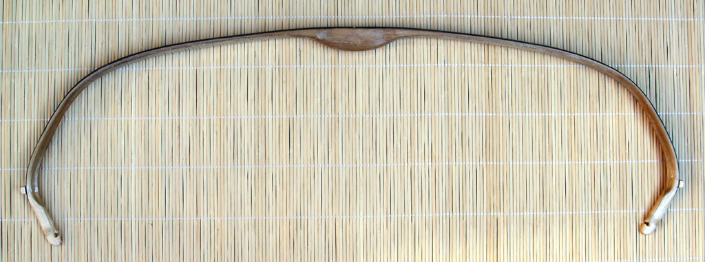 Maße, Gewicht, Auszug, Zuggewicht: Beim fertigen Bogen sind die Wurfarme hornseitig konvex, sehnenseitig flach mit Rundung an den Kanten. Der Sehnenbelag überlappt dünn den Hornbelag um ca. 2mm. Radien im Kasan- u. Tipbereich etwa nach Karpowicz, Sehnenlänge 118,5cm. Die Ausgangs-WA-Länge war 71,5cm bei einer Dicke von 16mm, wobei später die Tips um 4-5cm gekürzt wurden. Die WA-Breite betrug anfangs 28mm und wurde nach dem Hornauflegen seitlich auf ca. 26-27mm abgearbeitet und ab dem Kasanradius zu den Tips hin gleichmäßig verschmälert. Vor dem Sehnenstuhl beträgt die WA-Breite 19mm. Der hornbelegte Holzkern war zunächst 5mm dick bei rechteckigem Querschnitt und bekam vor dem Auflegen der Sehne einen trapezförmigen Querschnitt: aussen 2,5mm Dicke und ein Mittenstreifen von 8mm in ursprünglicher Dicke, alle Kanten gerundet. Die endgültige Hornlage ist im Sal-Bereich 3,5-4mm dick und aussen konvex. Die endgültige Dicke der getrockneten Sehnenschicht beträgt im Sal-Bereich 2mm mittig und an den Rändern bis 3,5mm (hätte ewas dicker sein können). Einige Maße sind auch auf den Fotos angegeben. Zuggewicht 41# bei 18 - 22°C und 28“ Auszug, Auszugslänge (nicht bis zum Ende ausgetestet) mind. 32“ ohne Stacking, Gewicht 356g.