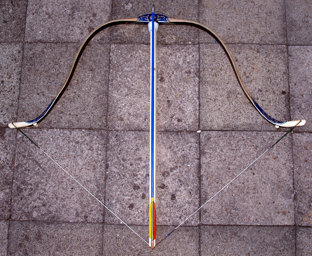 Aufbau: 3-teiliger Kompositbogen, Mittelstück und Wurfarme mit Siyahs aus ofengetrocknetem Bergahorn (Bretter vom Laubholzsägewerk), Bauchseite Wasserbüffelhorn aufgeklebt mit Hausenblasenleim, Rückenseite Straussensehne mit Hasenhautleim, Horn und Holz mit Längsrillen versehen. Sehnenstuhl aus Ahorn aufgeklebt mit Hasenhautleim, beide Fügeflächen mit Rillen. Tip mit wenigen mm Ahorn verstärkt. Grundlackierung Harttrockenöl (Harz-Öl-Verkochung), Farbpigmente mit Siegellack angerieben und Farbschicht später mit Siegellack überlackiert. Sehne: Dacron B50 endlos, 8 Stränge. Unter den Nocks Sehnenumwicklung. Der Celik ist aus Kamelknochen. Auf einen Überzug der Sehnenlage mit z.B. Leder oder Rohhaut habe ich verzichtet, um die Veränderungen des Sehnenbelags über die Zeit hinweg beobachten zu können.