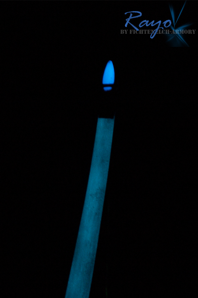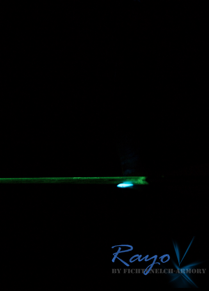 Ich habe in den Kleber phoshorisierende Pigmente mit eingemischt und so strahlt das tagsüber sichtbare Padouk-furnier nachts im fetten Blau, die Tips fangen an zu leuchten, die Pfeilauflage strahlt und am Bogenbauch gibts auch noch ein Paar "Highlights".