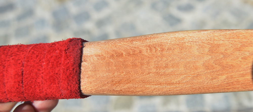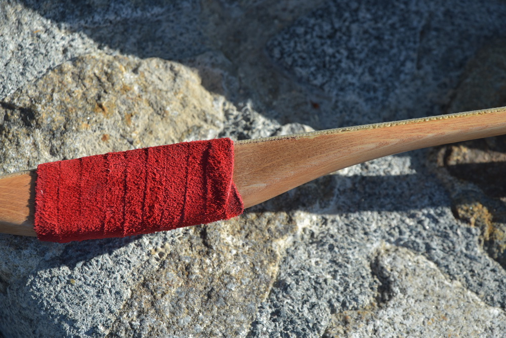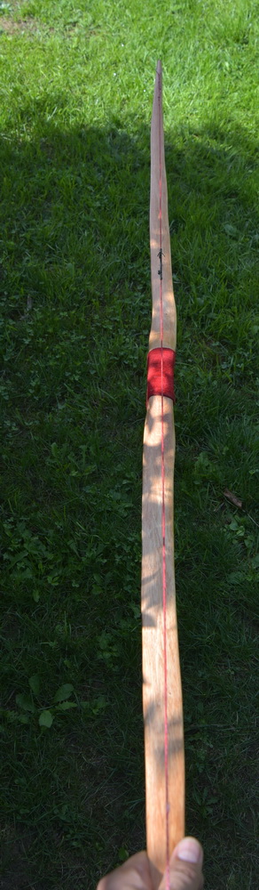 Länge 162 cm NzN, 38# bei 27 Zoll, Halbpyramide von 4 auf 1 cm; 600 g mit Sehne und Griffleder.