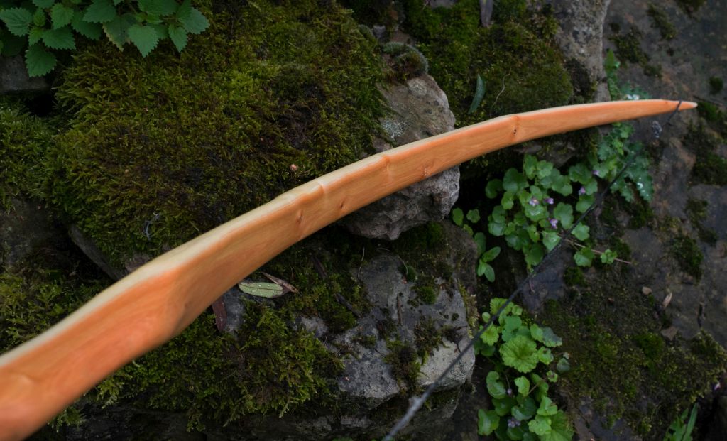 Bevor wer was sagt: Die Enden sind ein bischen steifer. Das habe ich bewusst so gemacht. Nach den Fadeouts setzen jeweils leichte Reflexe ein (sind jetzt etwas zurückggegangen, ich würde das Holz allgemein hinsichtlich Set im mittleren Bereich einordnen), deshalb kommt der Bogen im ersten der Drittel der Wurfarme scheinbar nicht so stark. Für den Sehnenwinkel habe ich die Enden deshalb weniger biegen lassen.