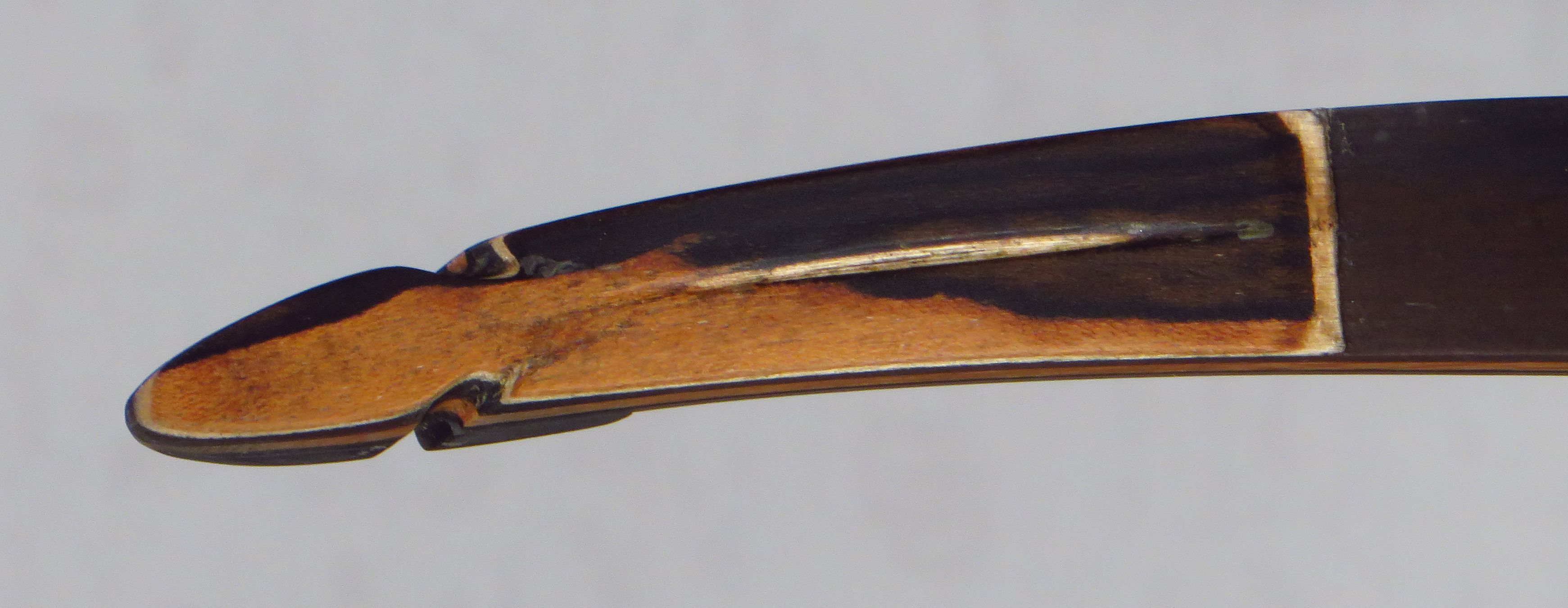hier mal einen Bogen, den ich umgerüstet habe für einen Schützen. Er hatte auf seinem "Hunter" Griff ein paar standard Hybrid Wurfarme. Da er jedoch einen 32" Auszug hat, gehen die nach hinten raus sehr hart. Also habe ich ihm etwas längere gebaut mit Zierfurnier seiner Wahl - Zirikote Splint/Kern auf den Rücken und Zirikote Kern auf dem Bauch. Kamen genau passend mit 41lbs@32" raus