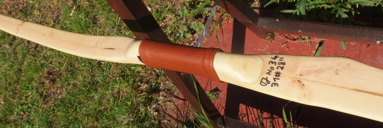 Aus einem kleineren Hartriegel-Stämmchen gespaltene Hälfte zu einem Bogen verarbeitet. Nichts wirklich besonderes, Versuchsobjekt für Horn-Inlays an den Tips und Sehnenkerben dann im Rücken, deshalb Präsi. Leichter Reflex im unteren Wurfarm, dickeres Astloch unten hinter dem Griff. Dünner Griff mit Ulme aufgedickt und Leder ummantelt, Arrowpass ebenfalls aus Horn. Sehne aus Fastflight (hatte noch eine in passender Länge da). Breite Nähe des Griffes ca 36mm, Dicke ca. 17mm. NtN 167cm. Gab nur 31# her, schießt aber schön präzise. Hartriegel mit etwas Bast und Leinölfirnis als Finish sieht nett aus.