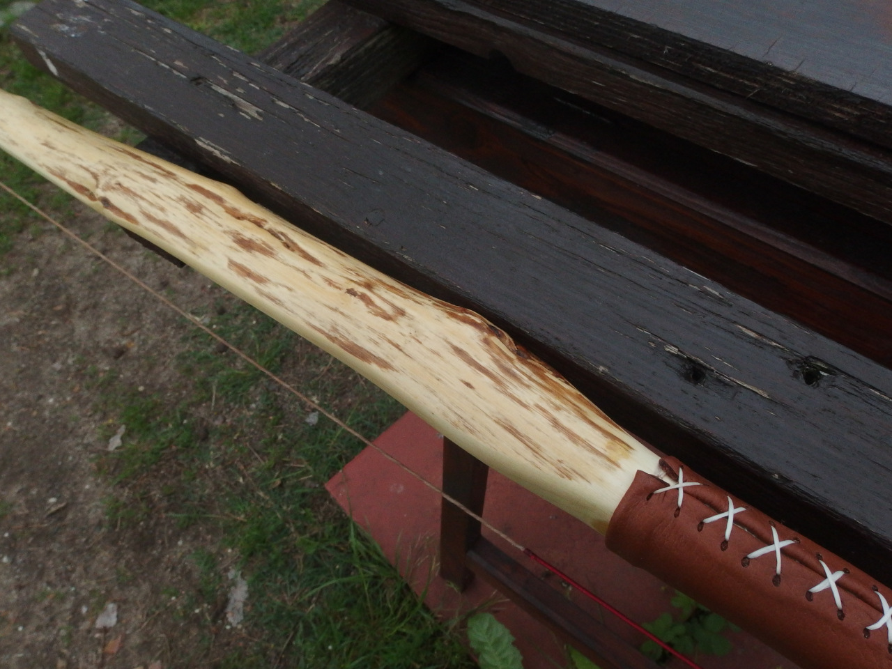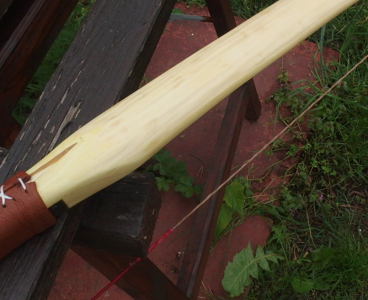 Beim diesjährigen Sap-Wettbewerb habe ich ein Pfaffenhütchen gebaut, das nach dem Einschießen leider zerbrach, weil es griffnah zu wenig bog. Außerdem baute ich einen 50#-Hasel, der zwar gut schoß, aber oben leider eine kleine Schwachstelle hatte, die immer mehr nachgab, wurde also auch nichts. Die Bogenreste standen dann die ganze Zeit rum. Da mir jetzt die Rohlinge ausgehen, hatte ich die Schnapsidee, einen Bastard-Bogen aus beiden Hälften zu bauen, Pfaffenhütchen oben, Hasel unten. Der Spleiß hätte symmetrischer und präziser sein können, das gute Endfest 300 plus ein paar Schraubzwingen halfen aber. Beide Wurfarme habe ich dann nachgetillert. Herausgekommen ist ein Hybrid mit immerhin noch 48# bei 28" AMO (mehr sollte man auch nicht ziehen), Länge NtN nämlich nur 166cm. Arrowpass war noch vom Pfaffenhütchen dabei. Griff aus Leder gabs neu dazu, das verdeckt die meisten Teile vom Spleiß. Schießt sogar überraschend flott, die Kürze wird ihren Teil dazu beitragen. Ich bin doch froh, das ausprobiert zu haben :D