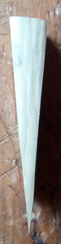 Zum Spleiß noch ein paar Details: ich habe tatsächlich vergessen, da überhaupt ein Foto von zu machen, bevor ich den Griff aufgeklebt habe. Ich habe aber noch den herausgeschnittenen Keil. Aus dem Pfaffenhütchen habe ich mit der Japansäge eine V-Form geschnitten, die bauchseitig stimmt aber zum Rücken hin leider auf die eine Seite gedriftet ist. Dadurch ist die eine Seite schmäler als die andere aber hält offenbar. Hier gibt es bei der Qualität der Form noch Luft nach oben. Das Gegenstück am Hasel habe ich mit dem Ziehmesser ausgearbeitet, passend asymmetrisch.