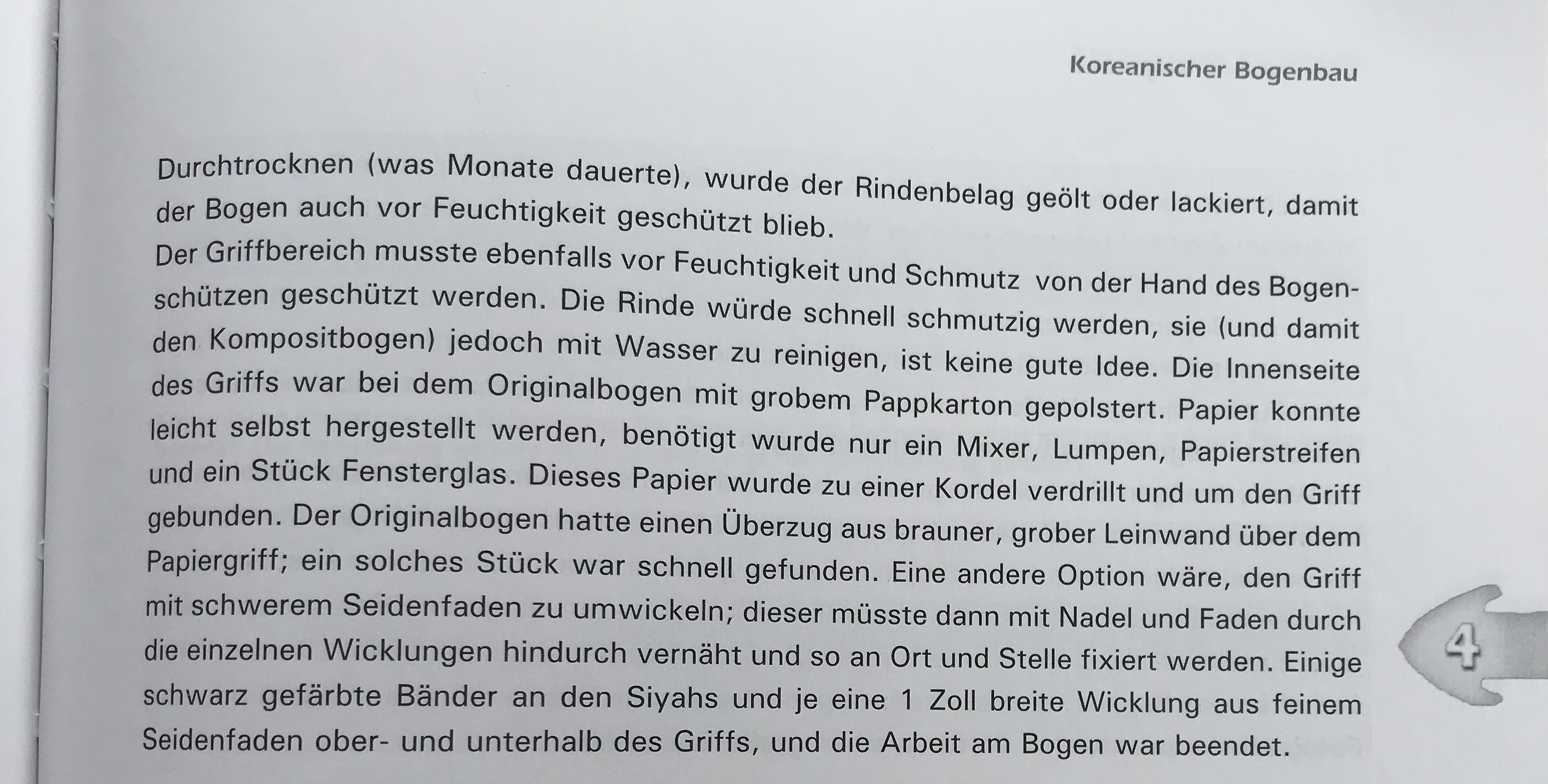 Ich habe jetzt natürlich Im Band III nachgelesen. Jeff Schmidt hat den Bogengriff genauso aufgebaut, wie ich. Allerdings gibt es keine Abbildung über den fertigen Griff in seinem Artikel. Er beschreibt auf Seite 127 lediglich, wie der Griff fertig gestaltet wurde und welche Materialien (Papier, Pappkarton, Leinen) dabei verwendet wurden. Es gibt keine koreanischen Bögen ohne diesen klobigen Griff, weder früher wurden noch heute werden diese Bögen ohne diesen Griff gebaut. Sonst sähe der Griff aus, wie bei einem Osmanen.