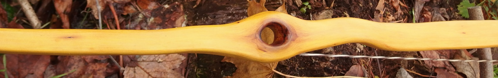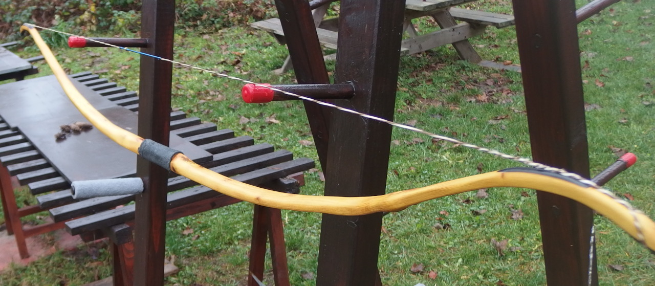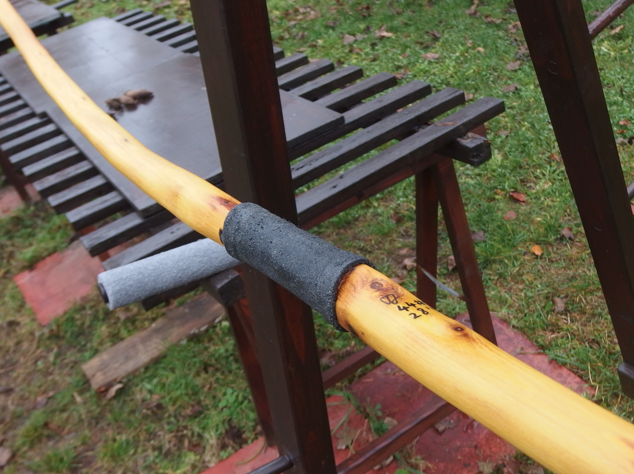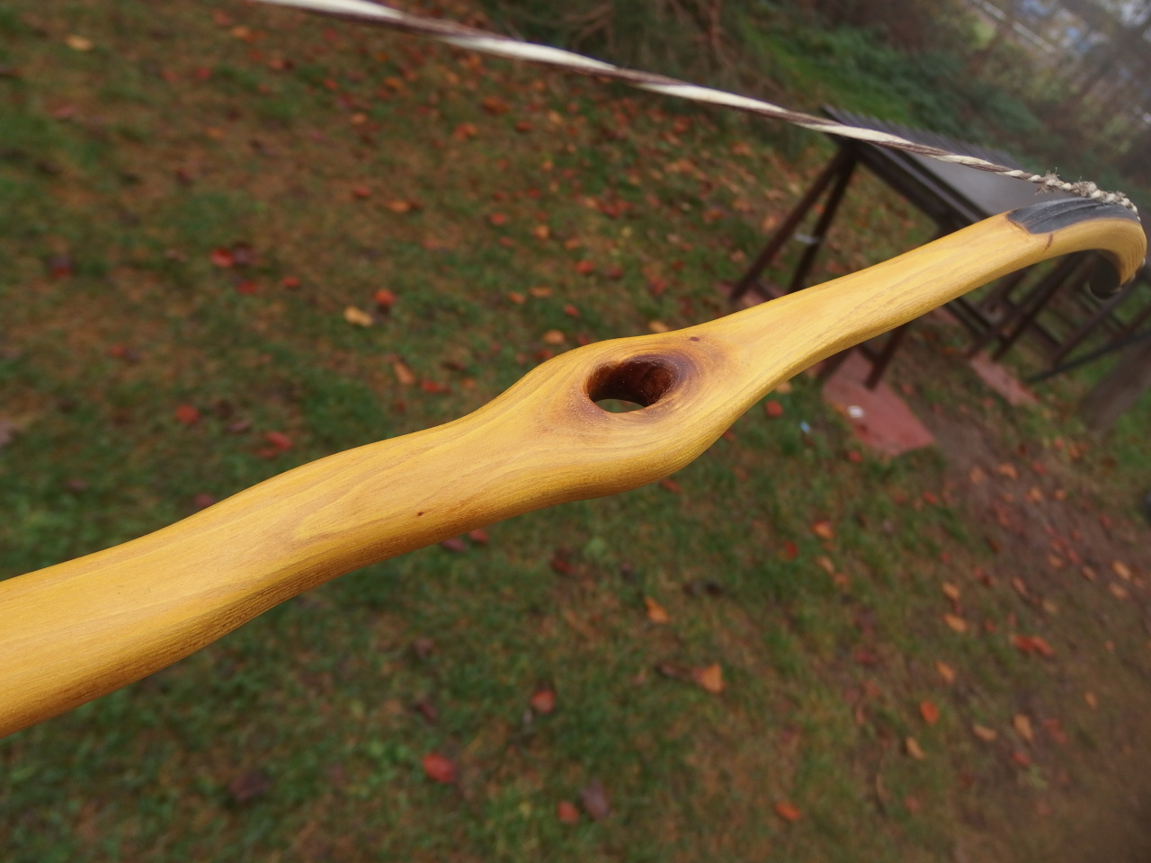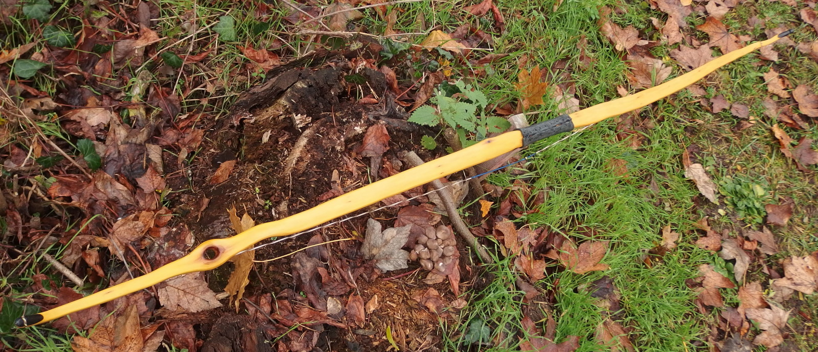 Dieses Stück fiel als Boden eines restlichen Staves ab, und war dann auf den zweiten Blick doch kein Abfall. Da er goldene Farbe hat der Name. Gewicht 460g mit allem (Sehne, Ledergriff). Arrowpass und Tip-Overlays aus Wasserbüffelhorn, ebenso Sehnenbänkchen. Die Recurves sind etwas stärker gebogen. Griff biegt leicht mit, mit Leder aufgefüttert, schwarzes Leder (mit Fleischseite) als Griff. Die ganze Bandbreite an Osage: Astloch, Wellen, Dellen, Ästchen. Finish Hartöl+Bienenwachsbalsam. Sehne 10 Strang Fastflight (Spectra 652). Bogenlänge 166cm, Zuggewicht ist 44#, wobei ich noch keinen Osage unter 44# gebaut habe