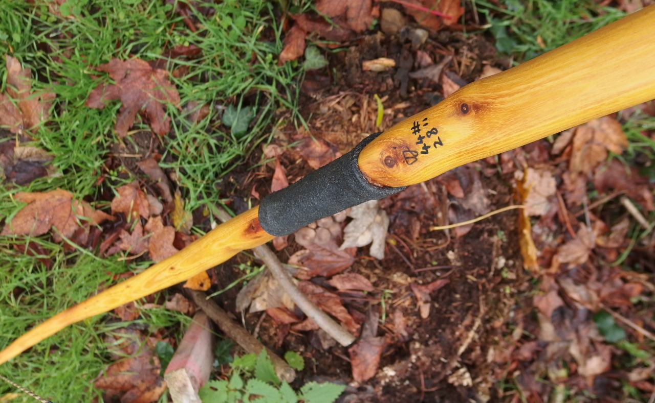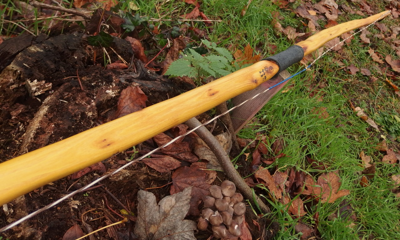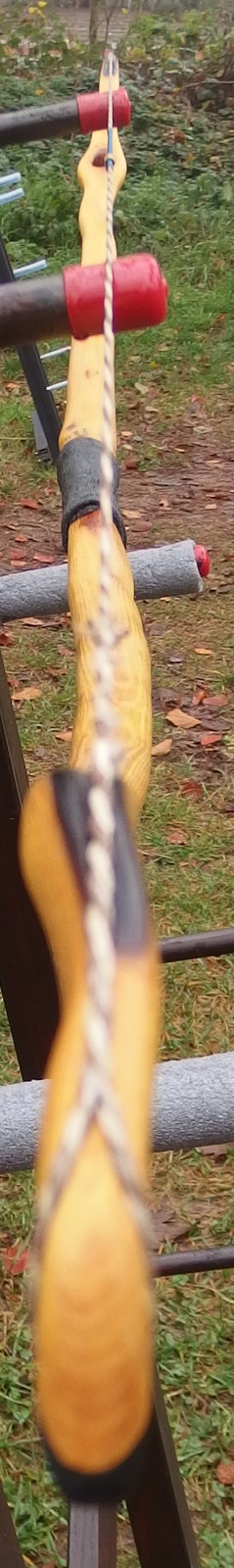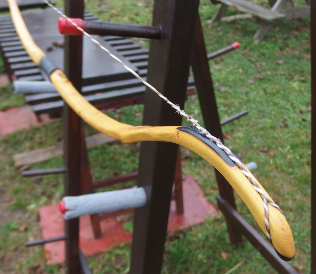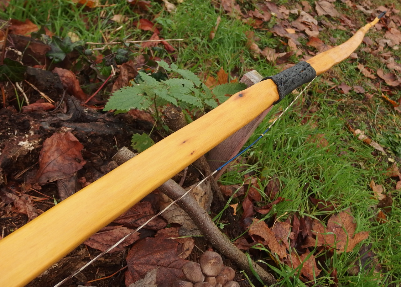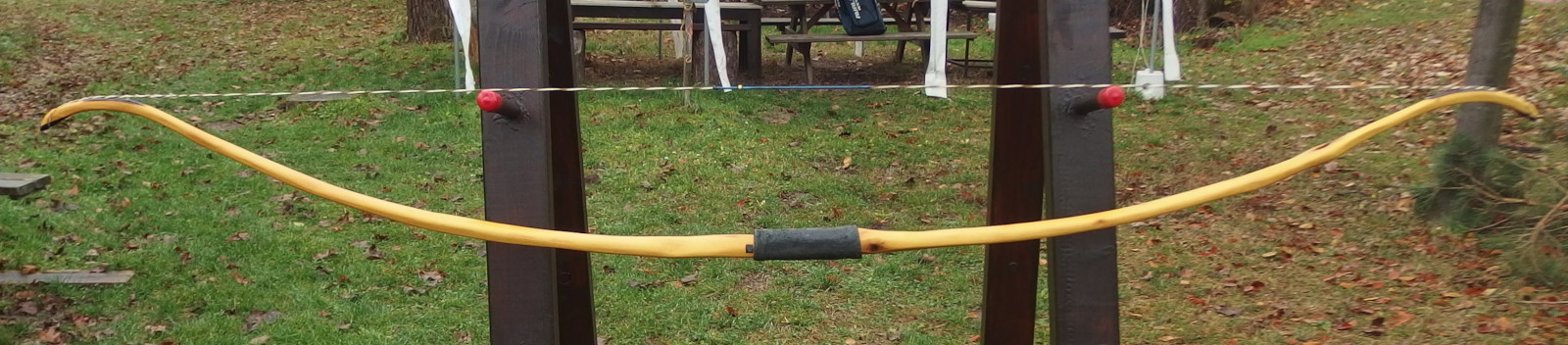 Dieses Stück fiel als Boden eines restlichen Staves ab, und war dann auf den zweiten Blick doch kein Abfall. Da er goldene Farbe hat der Name. Gewicht 460g mit allem (Sehne, Ledergriff). Arrowpass und Tip-Overlays aus Wasserbüffelhorn, ebenso Sehnenbänkchen. Die Recurves sind etwas stärker gebogen. Griff biegt leicht mit, mit Leder aufgefüttert, schwarzes Leder (mit Fleischseite) als Griff. Die ganze Bandbreite an Osage: Astloch, Wellen, Dellen, Ästchen. Finish Hartöl+Bienenwachsbalsam. Sehne 10 Strang Fastflight (Spectra 652). Bogenlänge 166cm, Zuggewicht ist 44#, wobei ich noch keinen Osage unter 44# gebaut habe