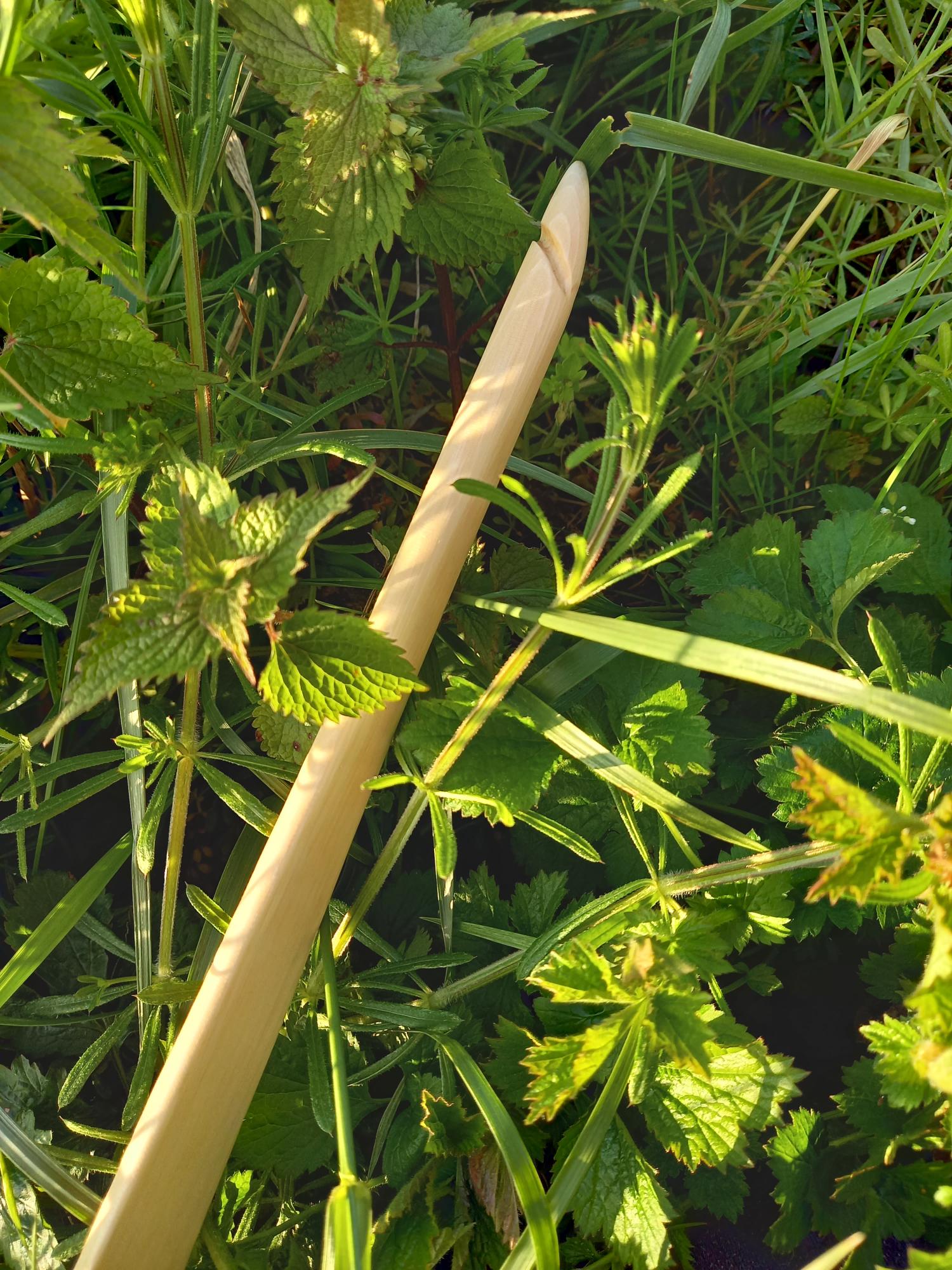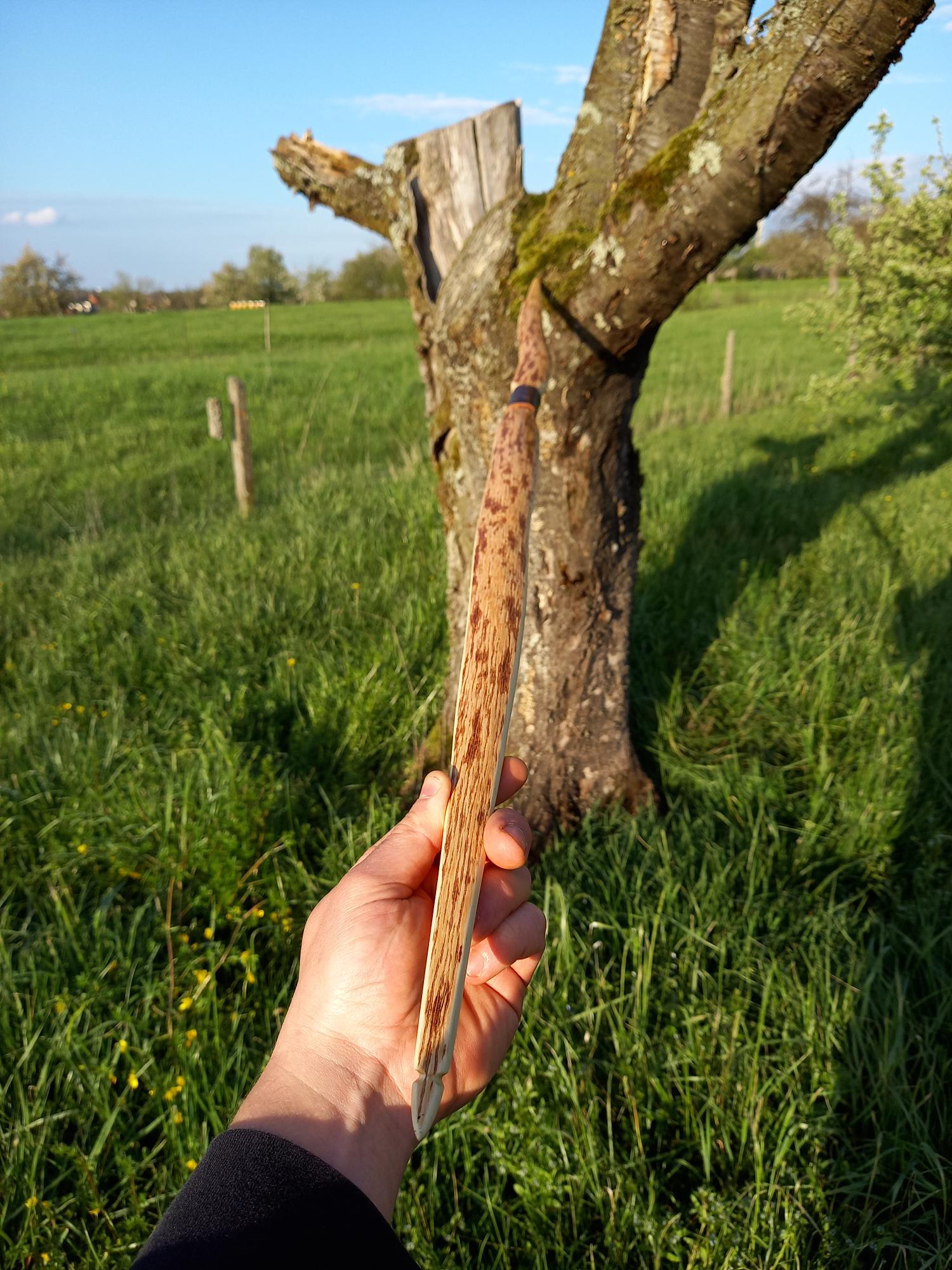 Der Rohling war ein Hasel mit einer ursprünglichen Dicke von 9cm den ich dann gespalten/halbiert und getrocknet habe.
