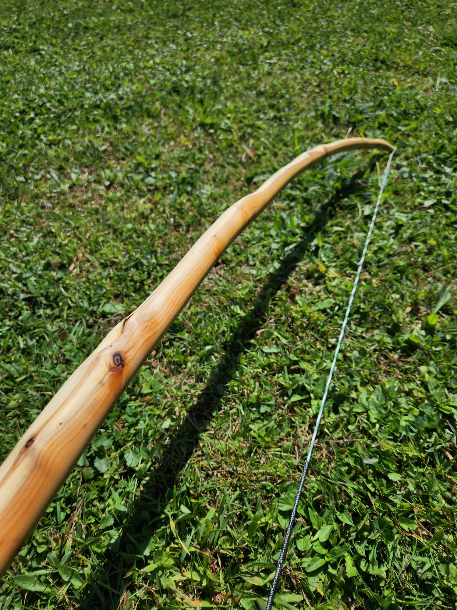 Den hab ich aus stark verasteter Garteneibe mit sehr dicken Jahresringen gebaut. Falls sich jemand erinnern kann: Ich hab vor einem guten Jahr mal gefragt ob bei übertrockneter Eibe das Kernholz trotzdem brauchbar ist. Der ist aus einem der Staves, die unter verdacht standen übertrocknet zu sein. Im Griff sieht man noch was vom Markkanal. Dadurch dass der Stamm recht dünn war, sind am Bogenbauch einige Äste zur Seite auslaufend zu sehen. Die Äste, die am Bogenrücken zu sehen sind, laufen deshalb aber nicht bis zum Bogenbauch durch. Somit hab ich beschlossen nichts auszubohren sondern einfach alle Stellen mit Totholz mit Epoxy zu füllen.
