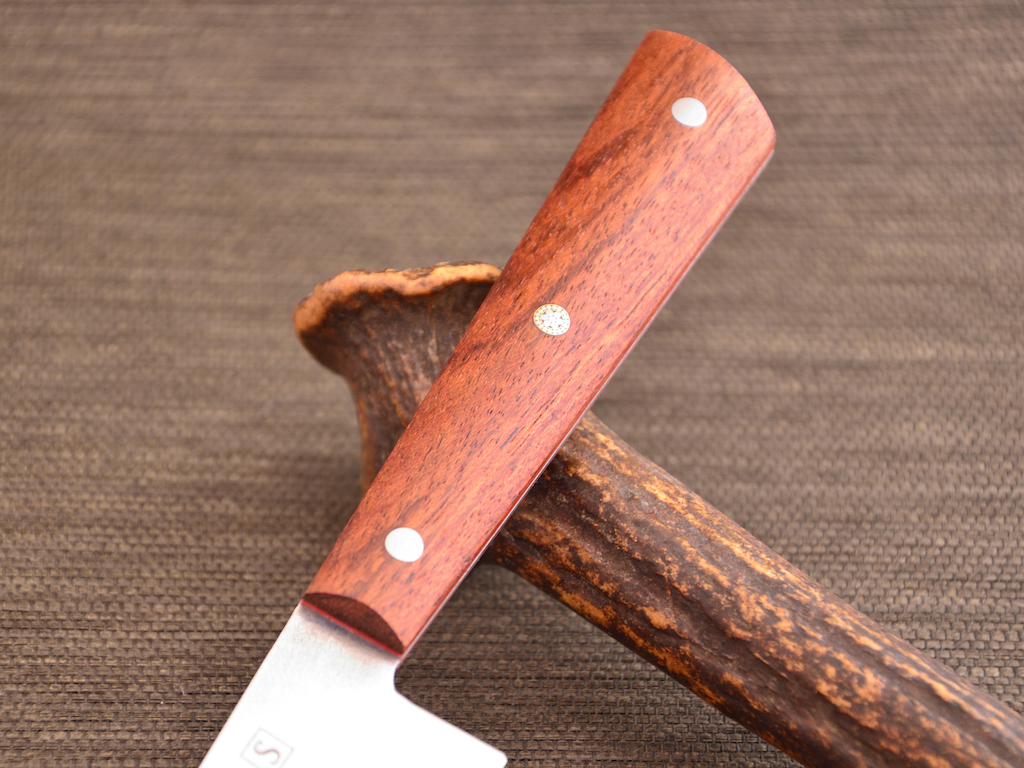 Das Holz ist hart und dicht und auch recht schwer. Mein Stück hatte eine Dichte von 840 kg/m3, das ist im Bereich von Bankirai oder Ipe. Das Holz lässt sich gut bearbeiten. Beim schleifen brennt und schmiert es allerdings leicht, man muss das Band oft abziehen und langsam mit wenig Druck schleifen. Leider habe ich nichts mehr. Es hat genau für diese drei Messer gereicht. Ich habe das Holz nicht stabilisiert.