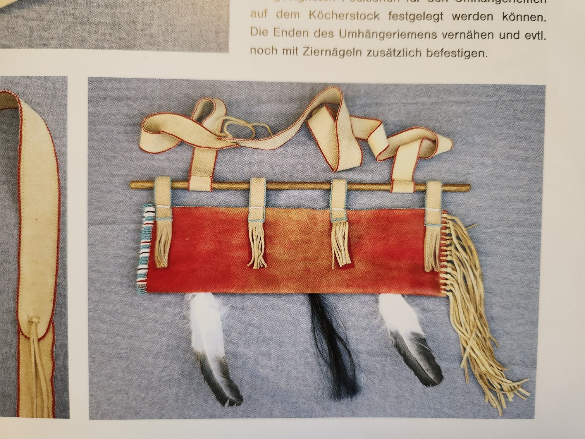 Ich habe nur im Riemenbereich den Filzstoff mit Uhu Kraftkleber aufgeklebt. Der Kleber bleibt elastisch. Im Randbereich habe ich, wie im Buch angeführt die Perlen aufgenäht. Im Köcherbereich ist der Filzstoff nicht geklebt. Am offenen Köcherrand habe ich den Filzsack vernäht und den Perlensaum angebracht, der Filzsack ist einfach in den Hirschledersack eingestülpt. So entstehen keine Falten, das ist die Gefahr beim Verkleben.
