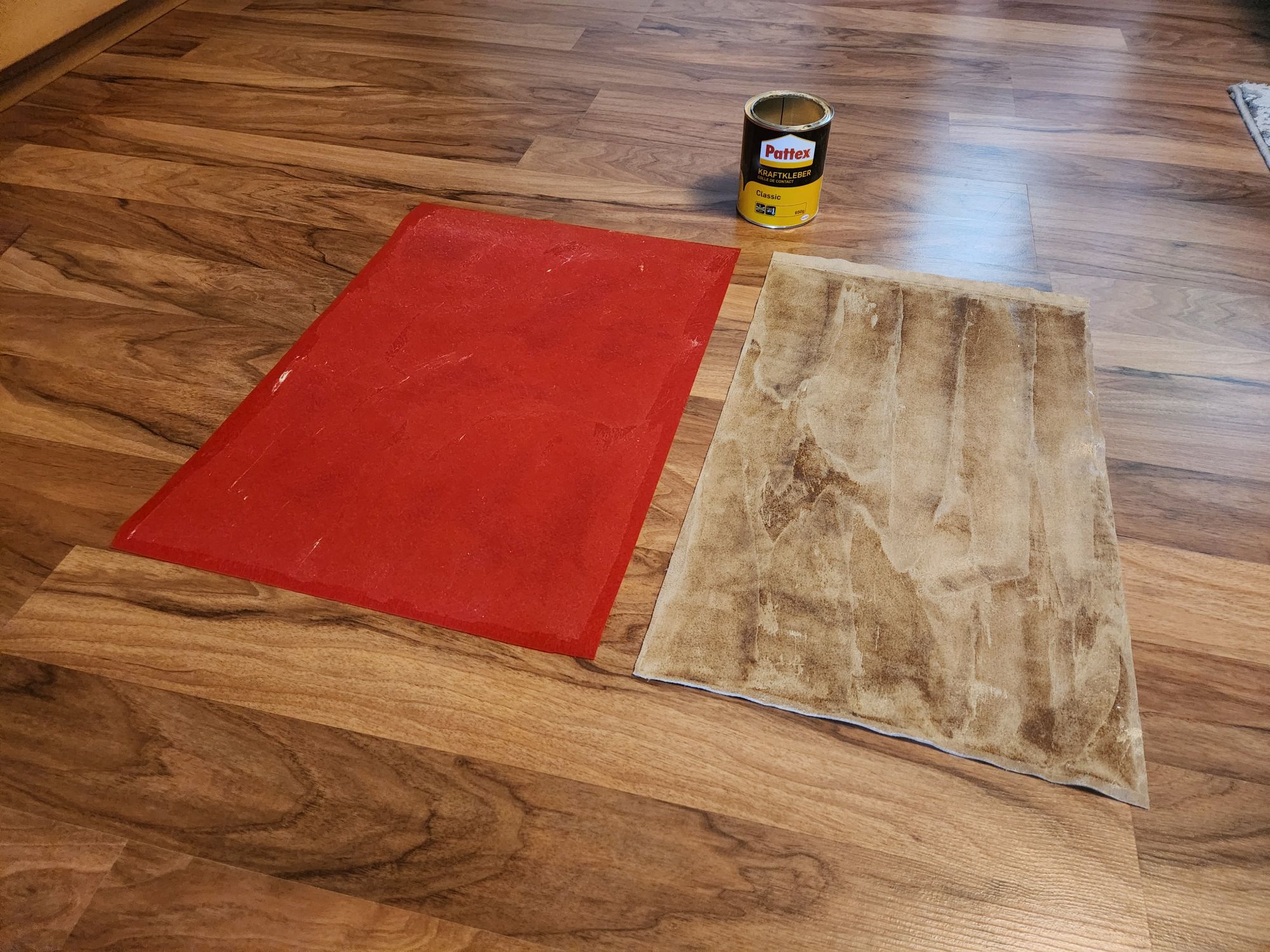 Den Futterstoff den ich bestellt habe, hatte ich mir anders vorgestellt. Ich habe Baumwollstoff bestellt da in der Anleitung von Wollstoff die Rede ist. Aber der macht nicht den Eindruck als hätte er auch nur neben Baumwolle gelegen 😂 (irgendwie wie Plastik und Hauchdünn). Ich hatte zwar schon versucht ihn mit einem speziellen Textilkleber aufs Leder zu kleben, aber das war nur eine rießen Sauerei ohne Erfolg. Der Kleber durchdrang den Stoff und da beide Kontaktflächen mit Kleber bestrichen werden sollten war es auch ein Ding der Unmöglichkeit so große Teile faltenfrei zu verkleben... Außerdem soll man später den Stoff bei den Halteriemen mit einer Zickzackschere schneiden. Da würde dieser Stoff hässlich ausfransen. Deshalb werde ich mich um was anderes umschaun. Momentan hab ich Filz im Sinn.